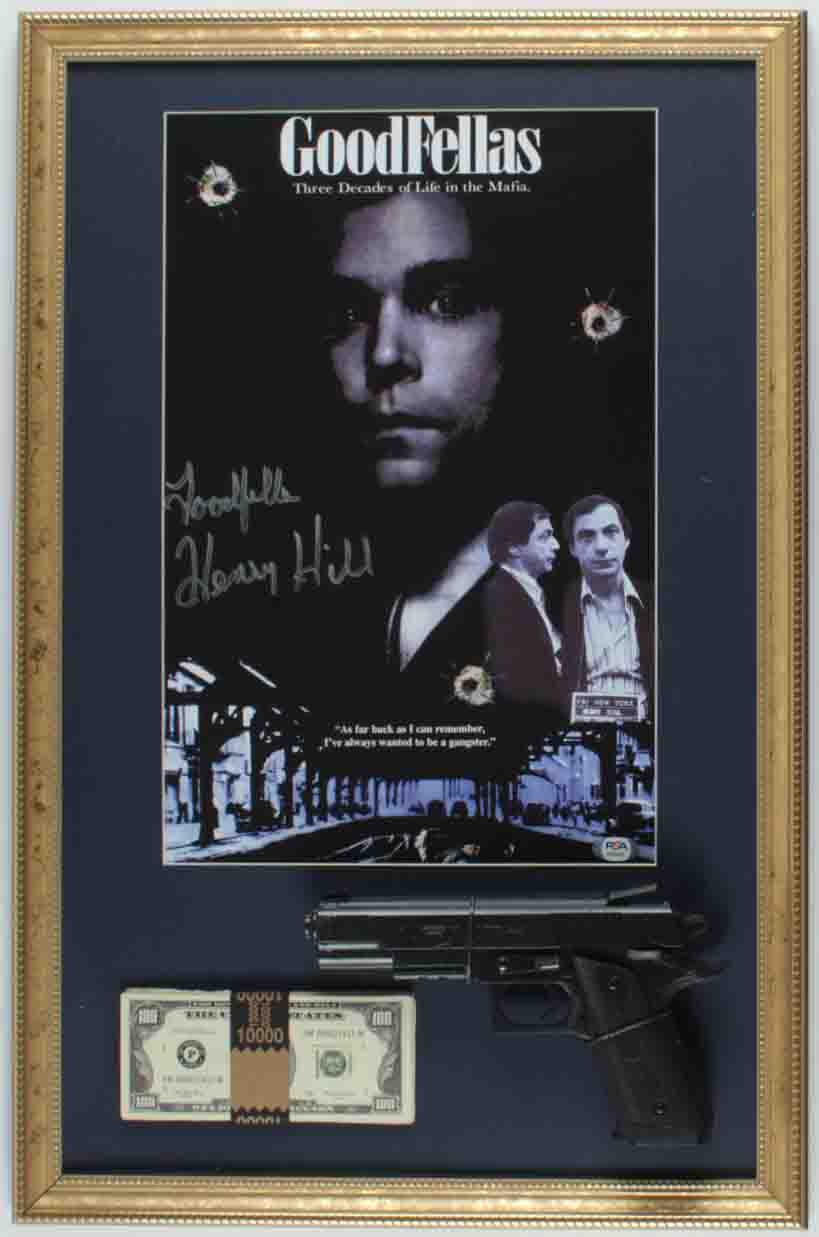 Henry Hill Signed "Goodfellas" 17x26 Custom Framed Photo Display Inscribed "Goodfella" with Replica Gun & Prop Money (PSA COA)