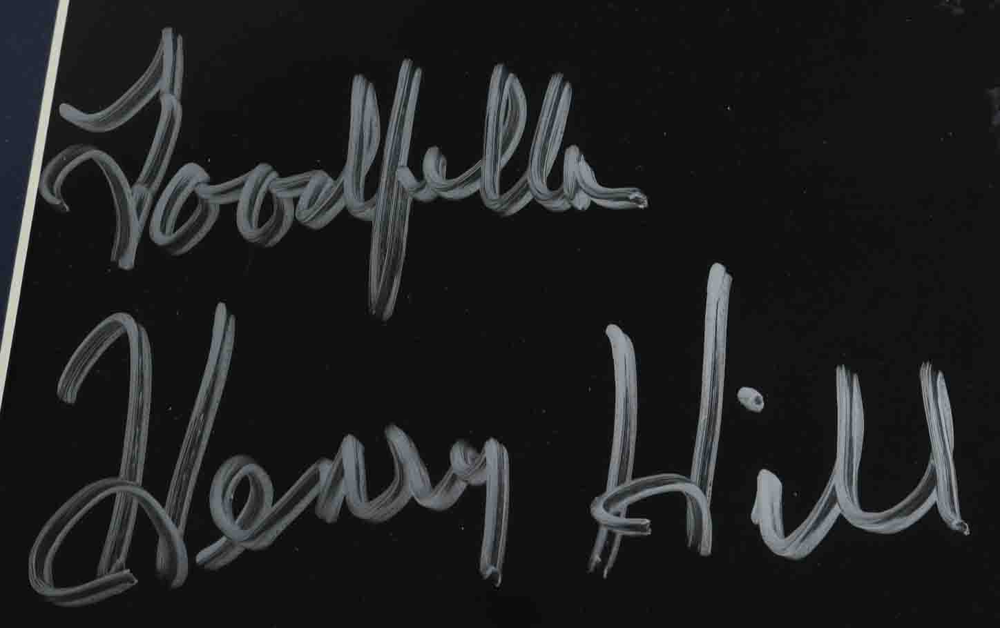 Custom frame measures 17" x 26" in size and features a photo that has been hand-signed by Henry Hill (D. 2012). Display also features a replica gun and stack of prop money.