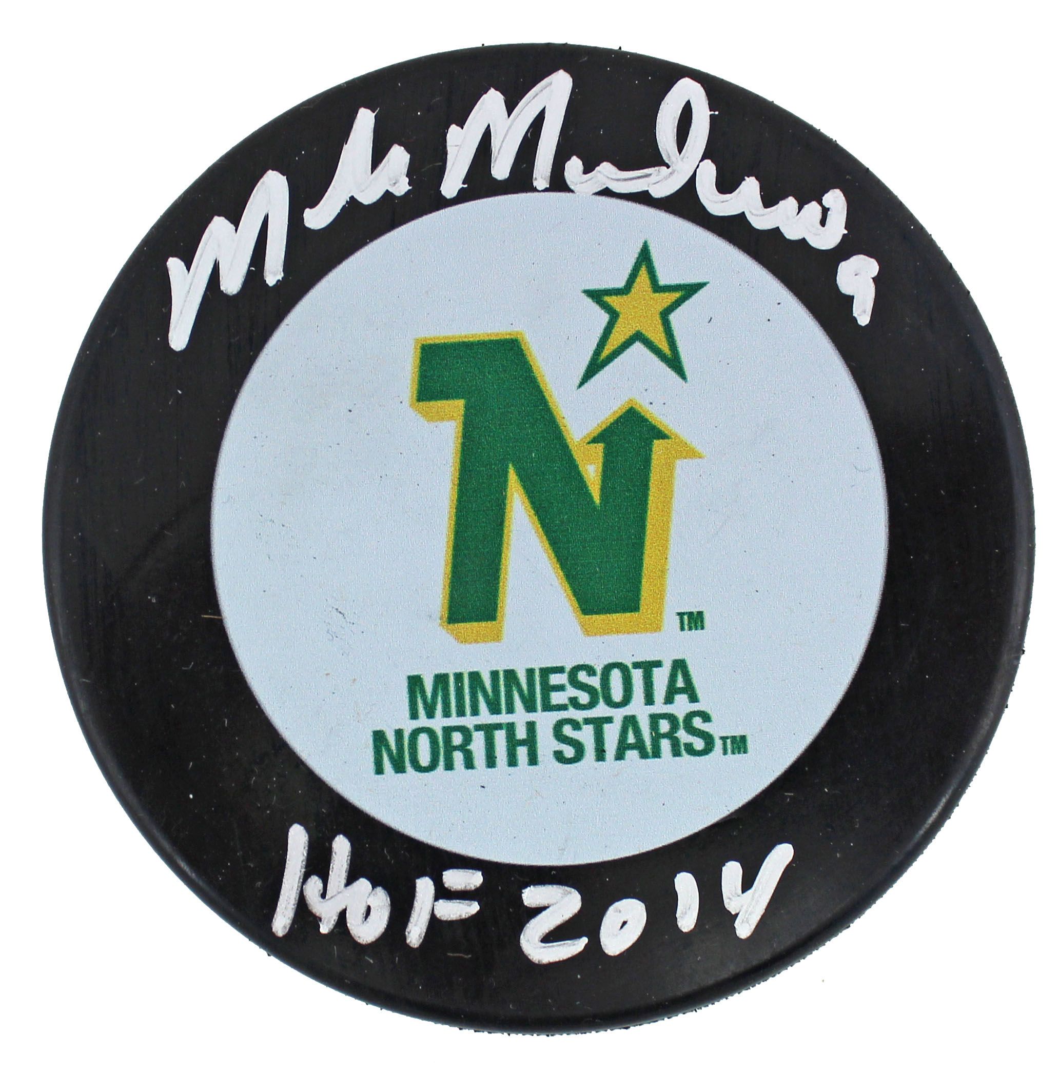 Minnesota North Stars logo hockey puck. Hand-signed and inscribed by Mike Modano (HOF).