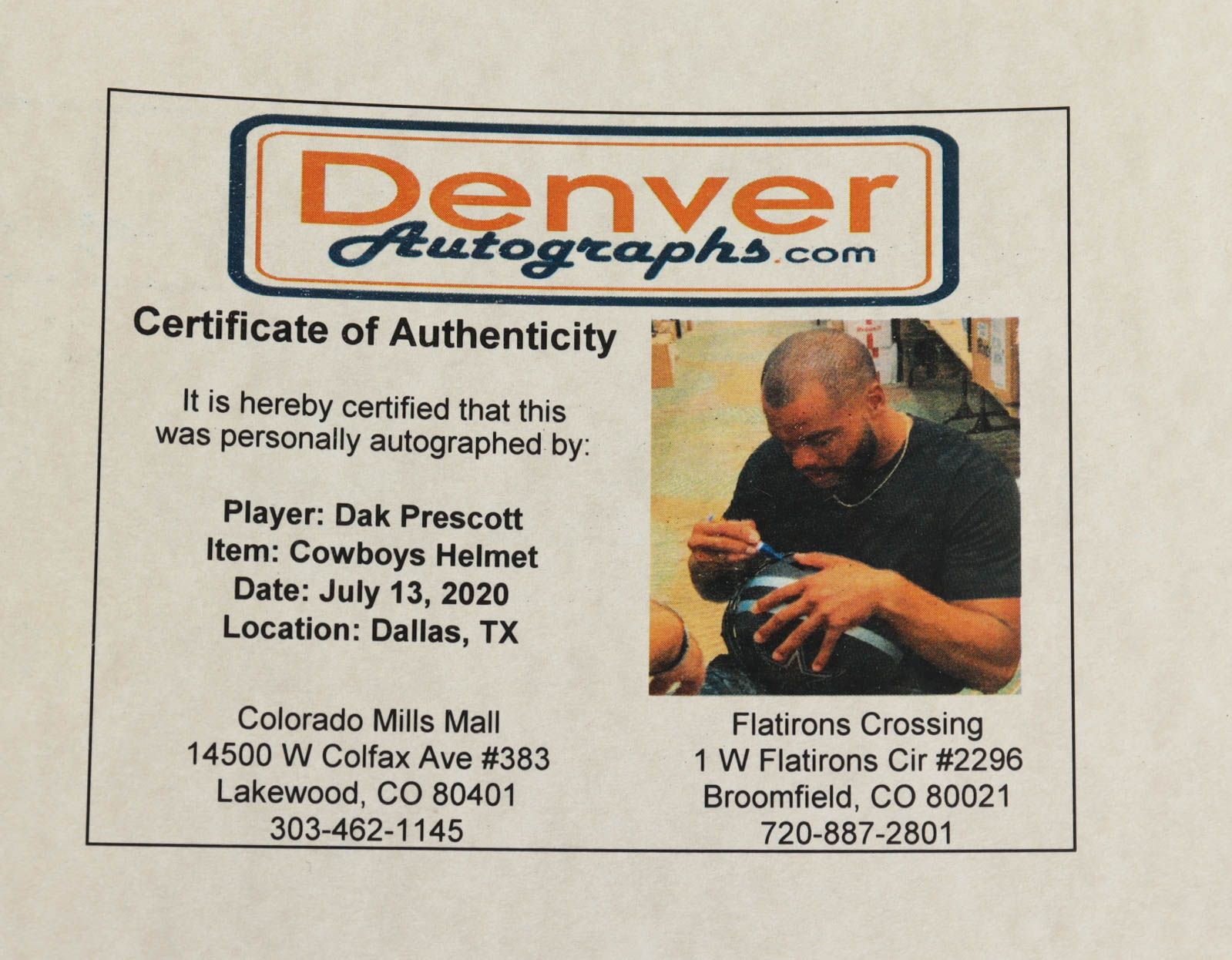 The lot / autograph(s) includes an official Beckett Authentication Services serially-numbered hologram and matching COA as well as an official Dak Prescott player hologram for authenticity purposes. The signing of this item was witnessed by Beckett. Also includes a proof picture from the signing.