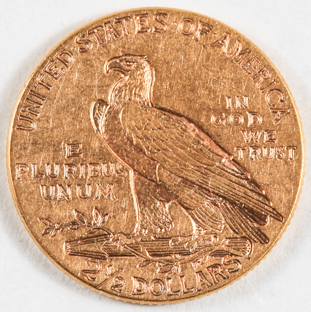 Designed by Bela Lyon Pratt, a student of Augustus Saint-Gaudens, the $2.50 Indian features legends and motifs that are incused rather than raised on the coin, making them one of only two U.S. coins minted in this manner. The obverse features a stoic Indian chief profile, surrounded by 13 small stars and the word "Liberty" along with the date. The reverse shows a regal bald eagle with a cluster of arrows and an olive branch, symbolic of war and peace, beneath the eagle’s talons.