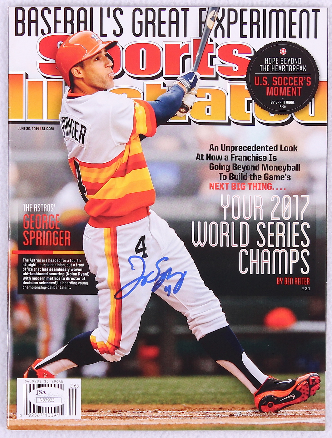 Sports Illustrated Magazine magazine dated June 30, 2014. Hand-signed in blue felt-tip pen by George Springer. The autograph includes an official James Spence Authentication (JSA) hologram and matching COA for authenticity purposes.