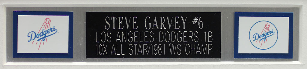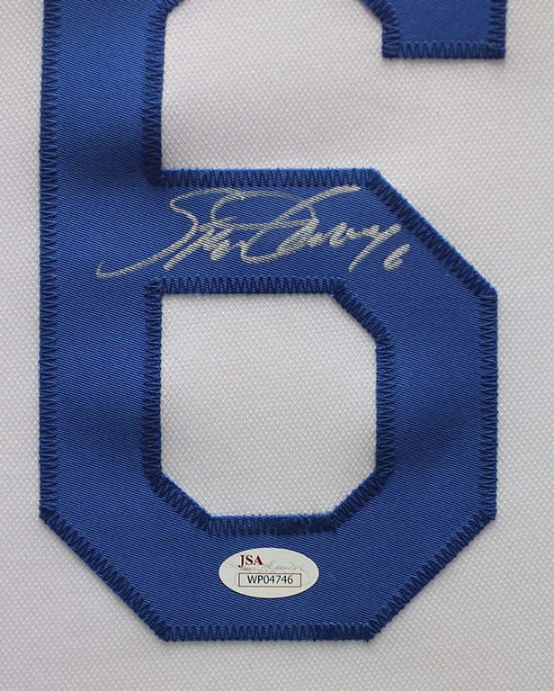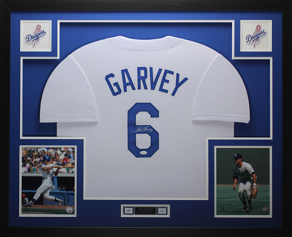 A beautifully framed autographed Steve Garvey Dodgers Jersey. The autograph was certified by JSA and includes a sticker on the Jersey and a matching certificate attached to the back of the frame.