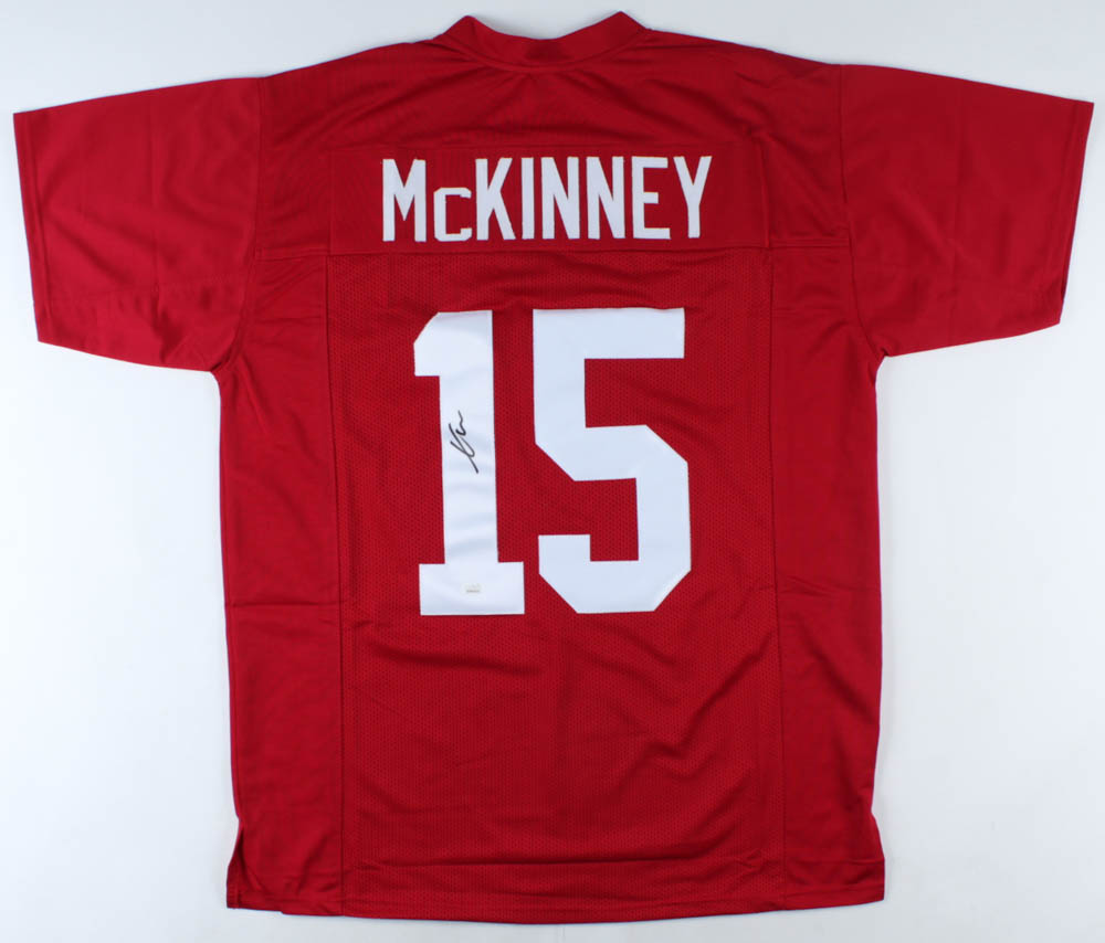 Custom on-field style jersey. Everything is sewn on, size XL. Has been hand-signed by Xavier McKinney.