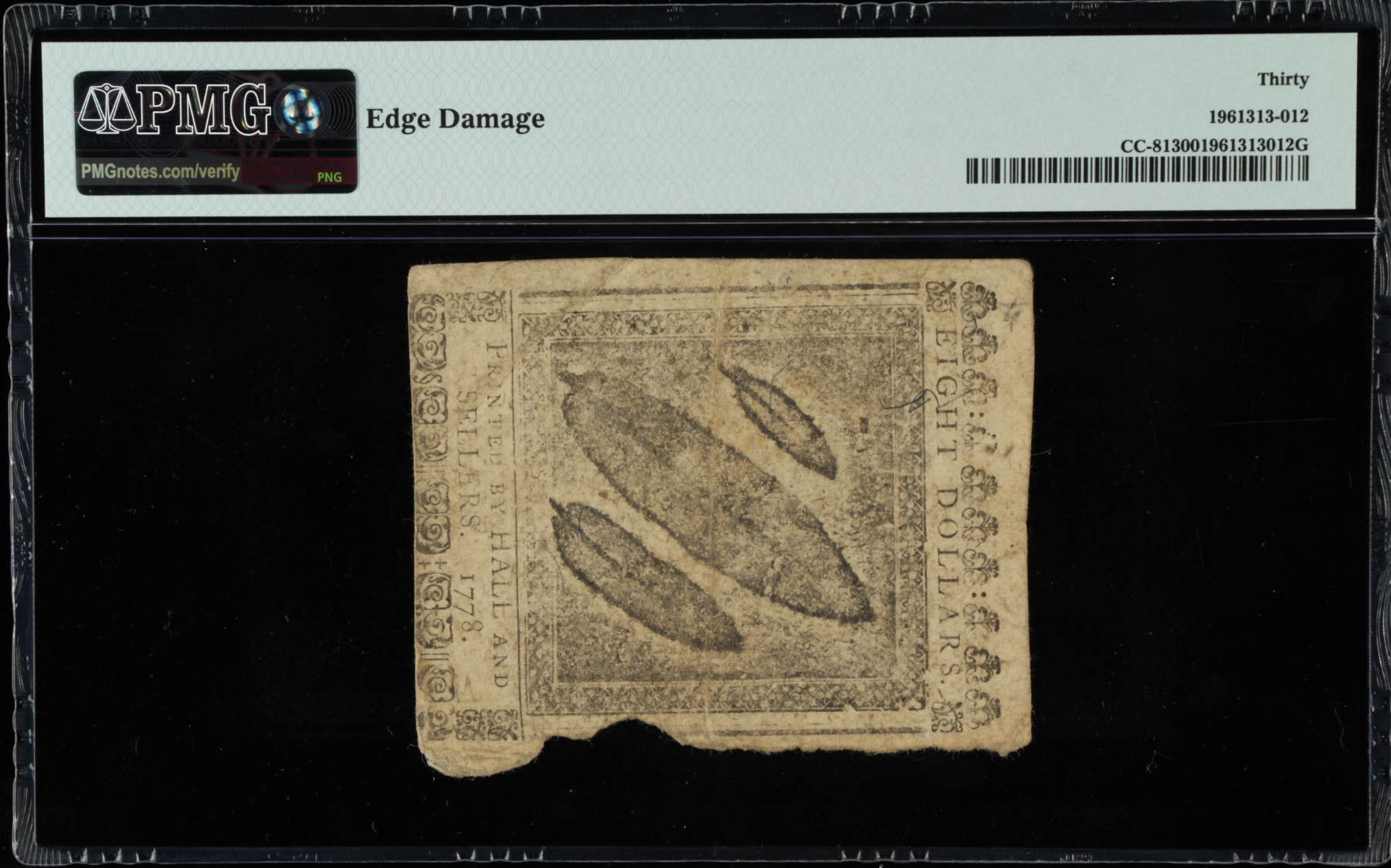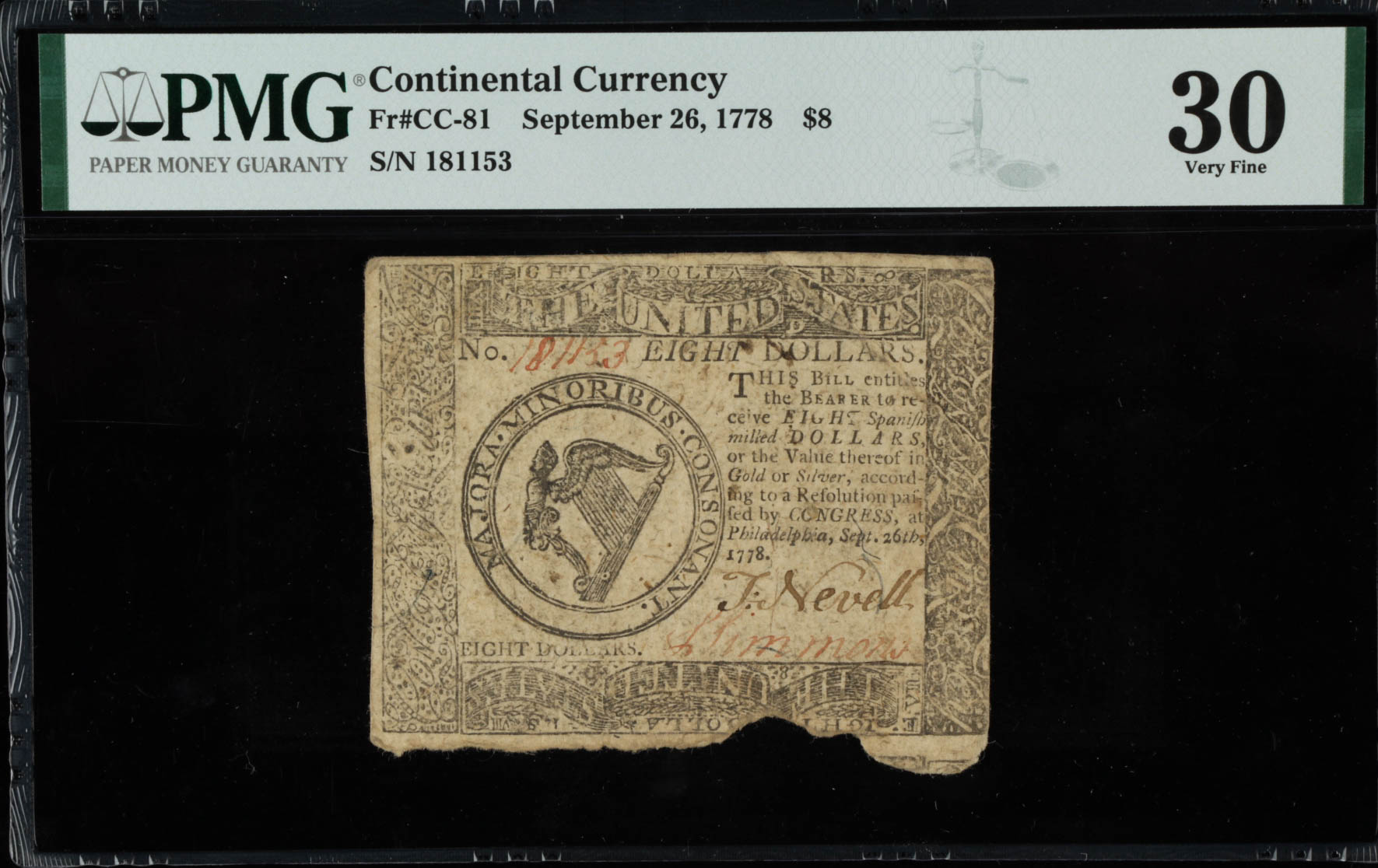 1778 Continental Currency $8 Eight-Dollar Colonial Currency Note - September 26th, 1778 (PMG Very Fine 30)