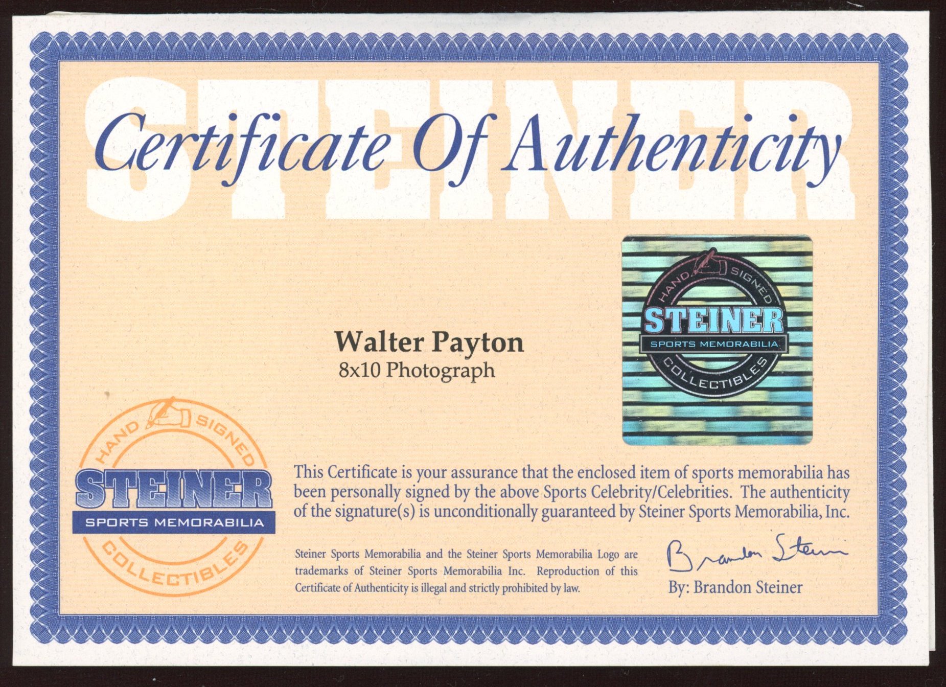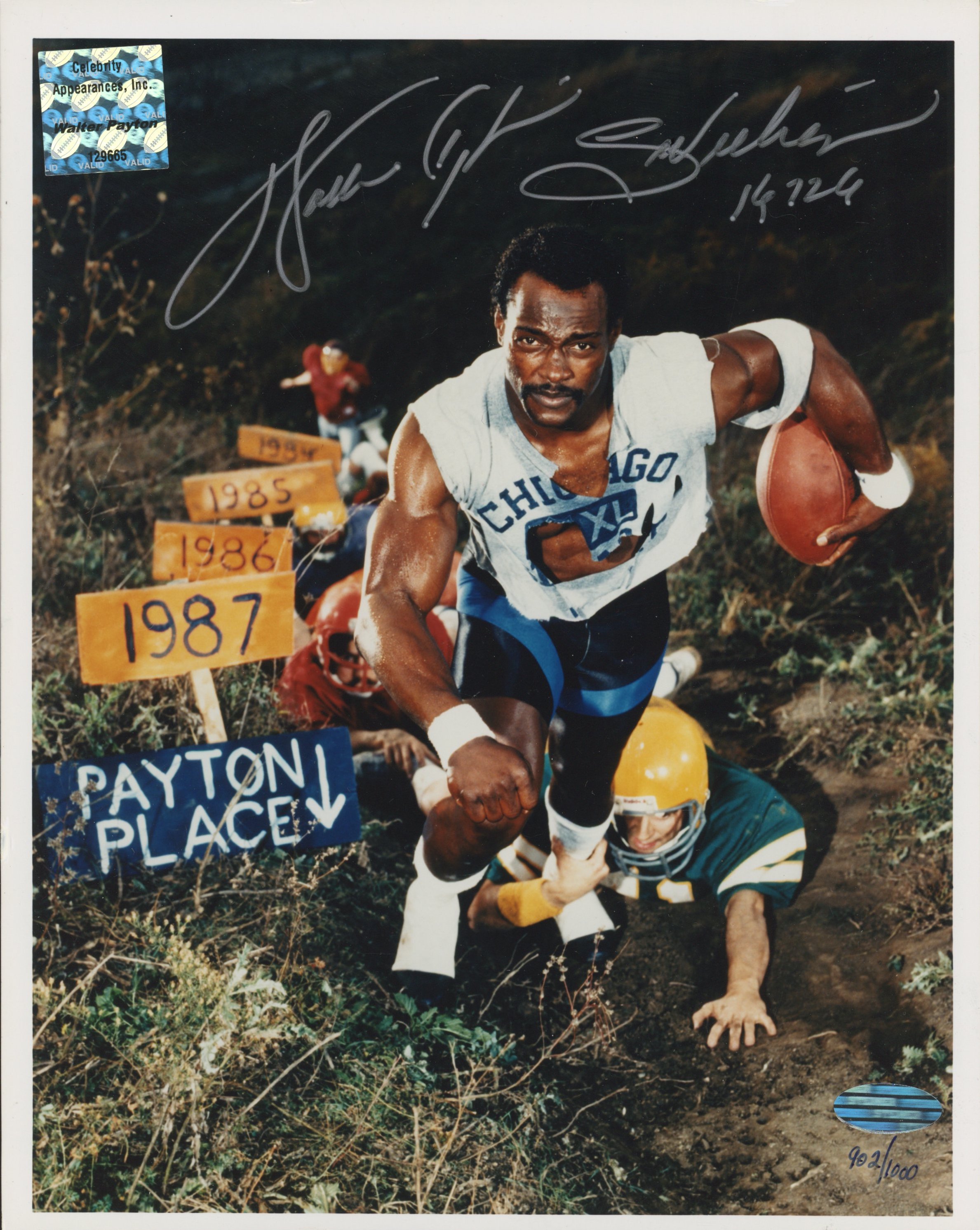Photo measures 8" x 10" in size and has been hand signed by Walter Payton (1999, Chicago Bears, HOF). The photo is limited edition and hand-numbered #902/1,000.