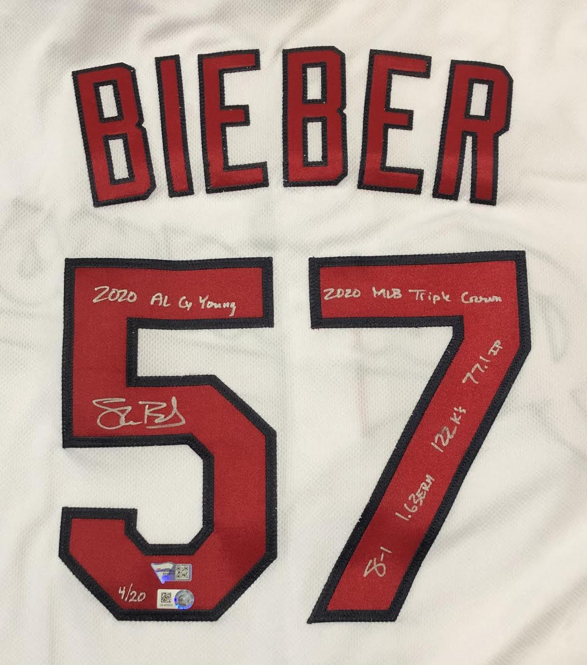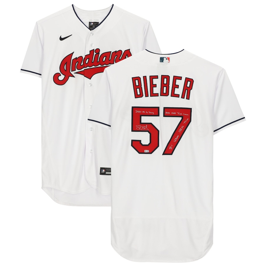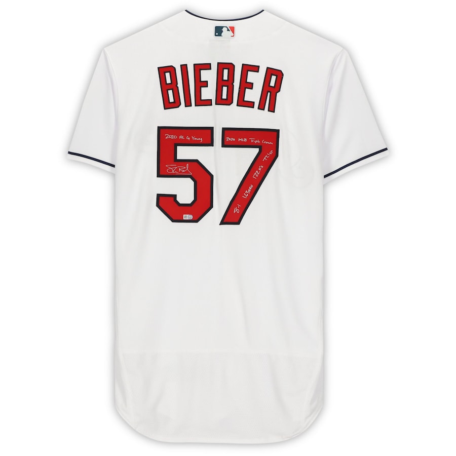 Nike on-field style jersey. Everything sewn on, size L. Hand-signed and inscribed by Shane Bieber (Cleveland Indians). The jersey is a limited edition and has been hand-numbered #/20.