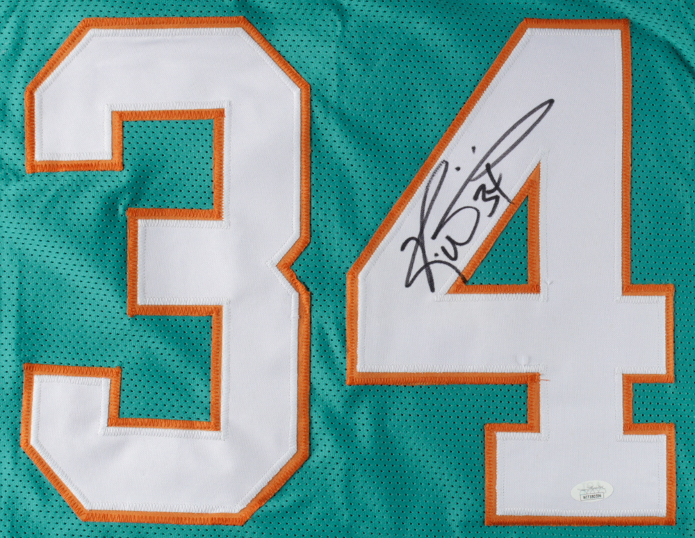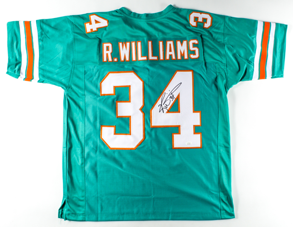Custom on-field style jersey. Everything is sewn on, size XL. Has been hand-signed by Ricky Williams.