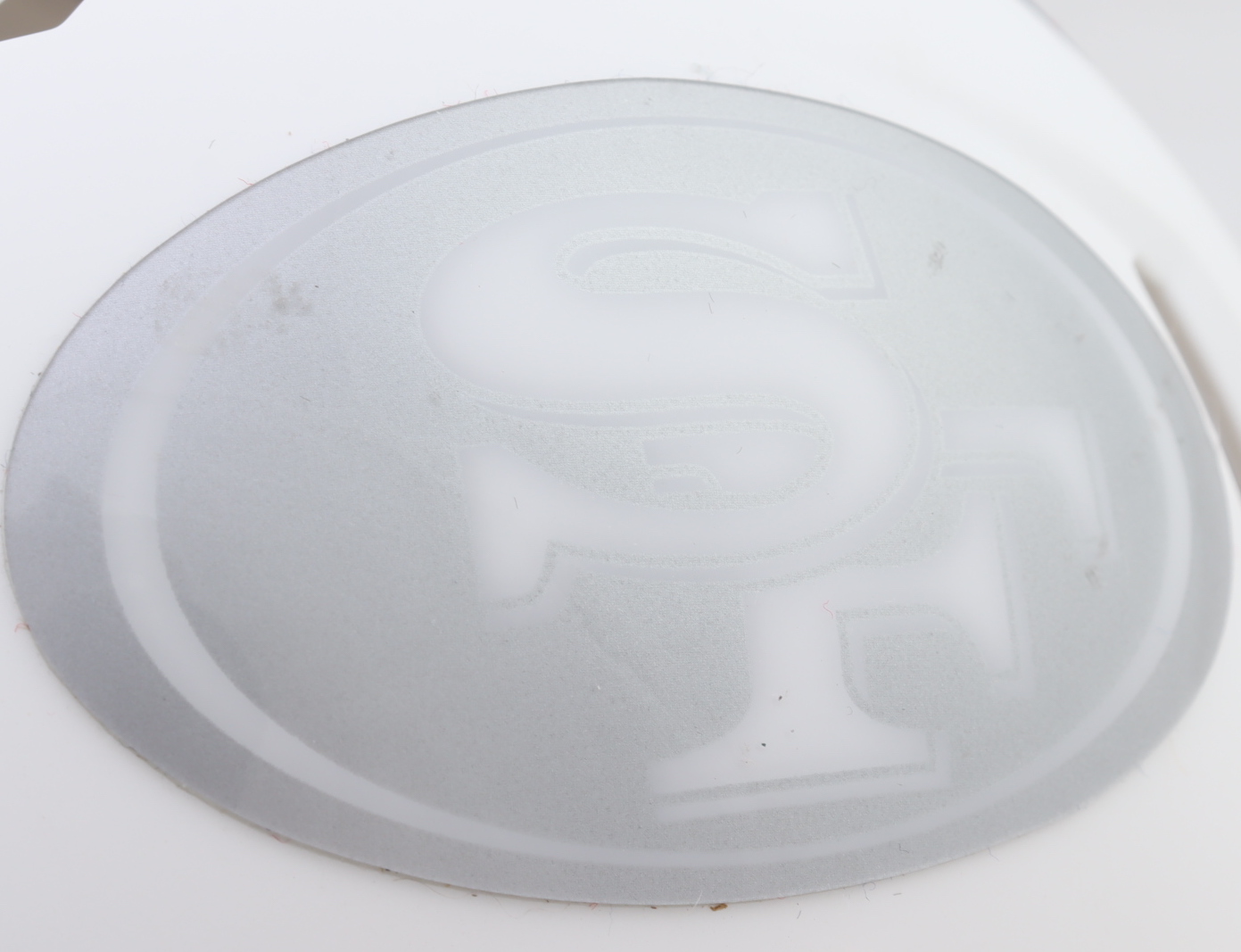 Riddell San Francisco 49ers white ICE speed mini helmet. Hand-signed by Jerry Rice (HOF). Please note, there are small marks on the helmet. See photos for details.