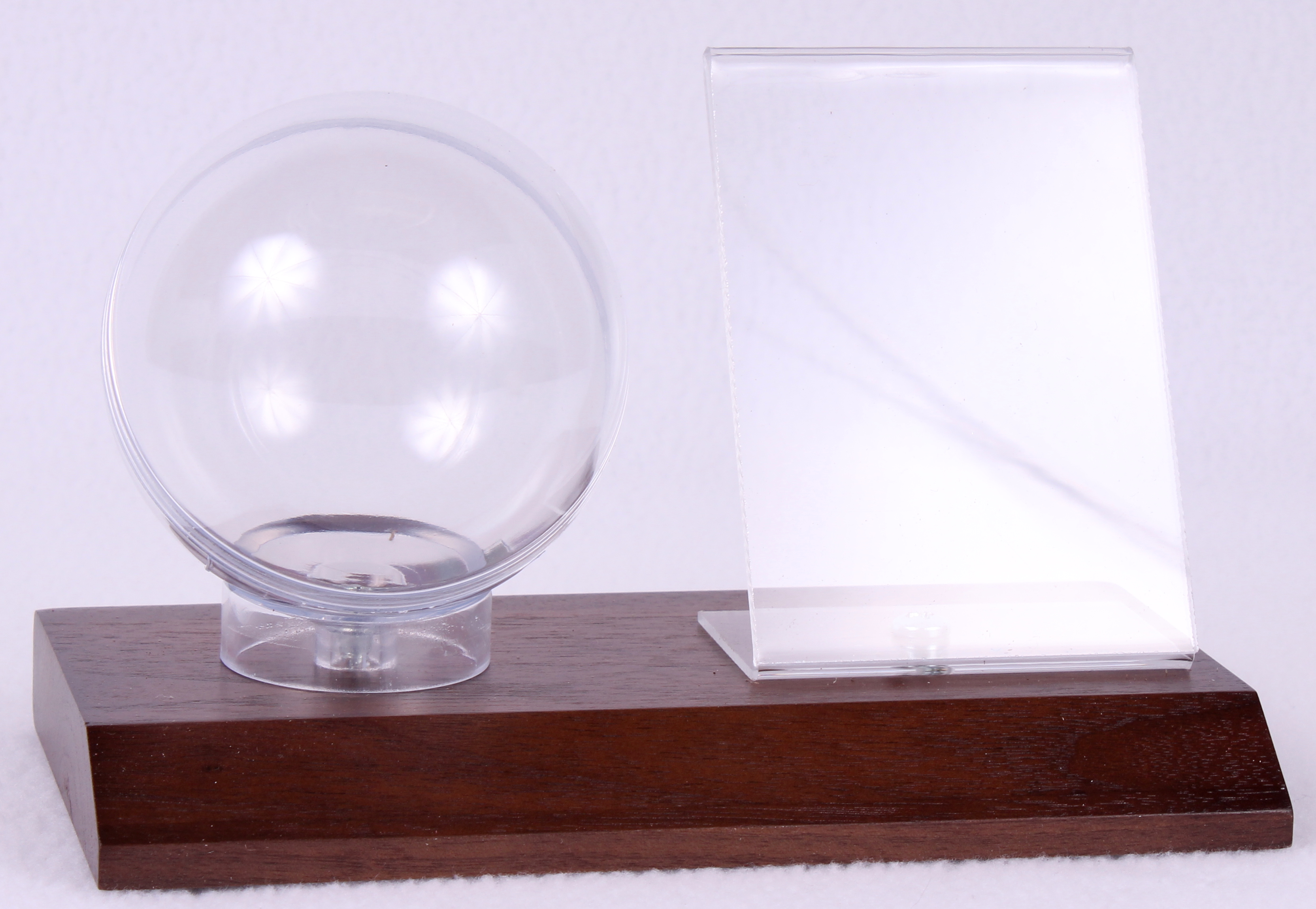 The BCW Woodbase Baseball & Card Holder features a solid walnut base, crystal clear card stand and globe with a slant seam. The case holds a regulation sized baseball and a standard sized trading card.