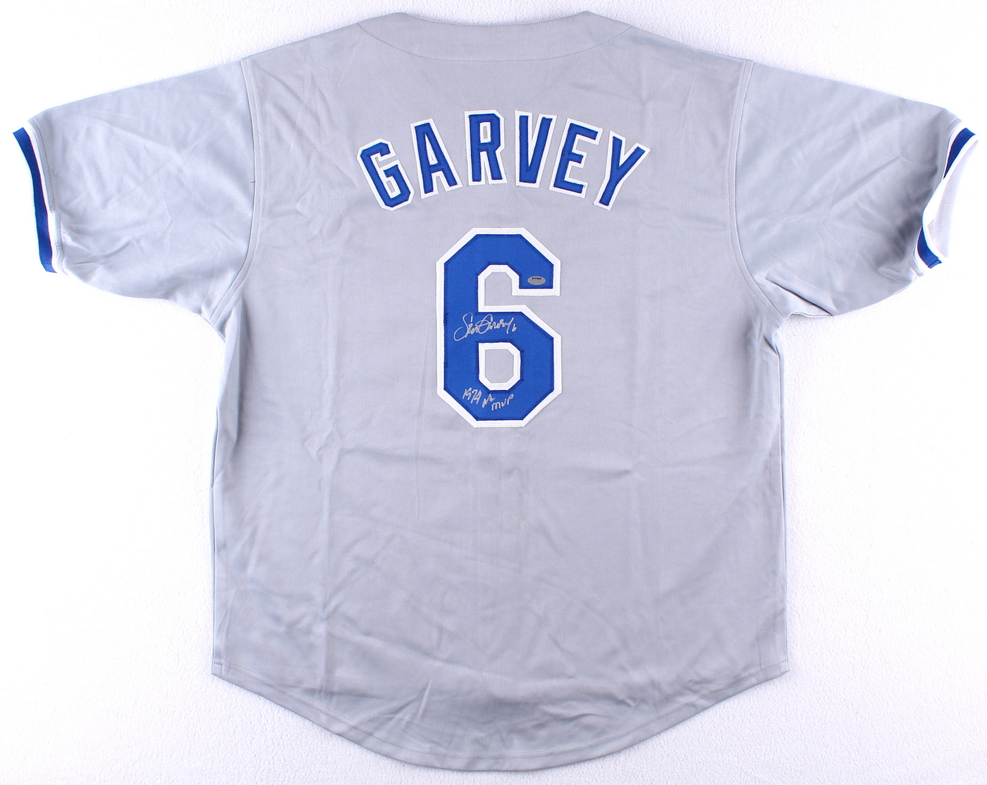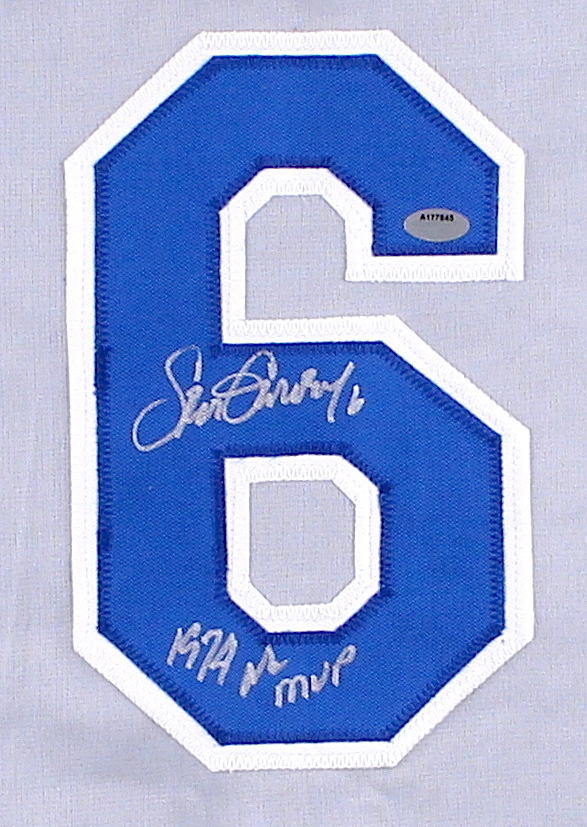 Custom on-field style jersey. Everything is sewn on, size XL. Hand-signed and inscribed in silver paint pen by Steve Garvey (Padres). The autograph includes an official Schwartz Sports Hologram and matching COA for authenticity purposes.