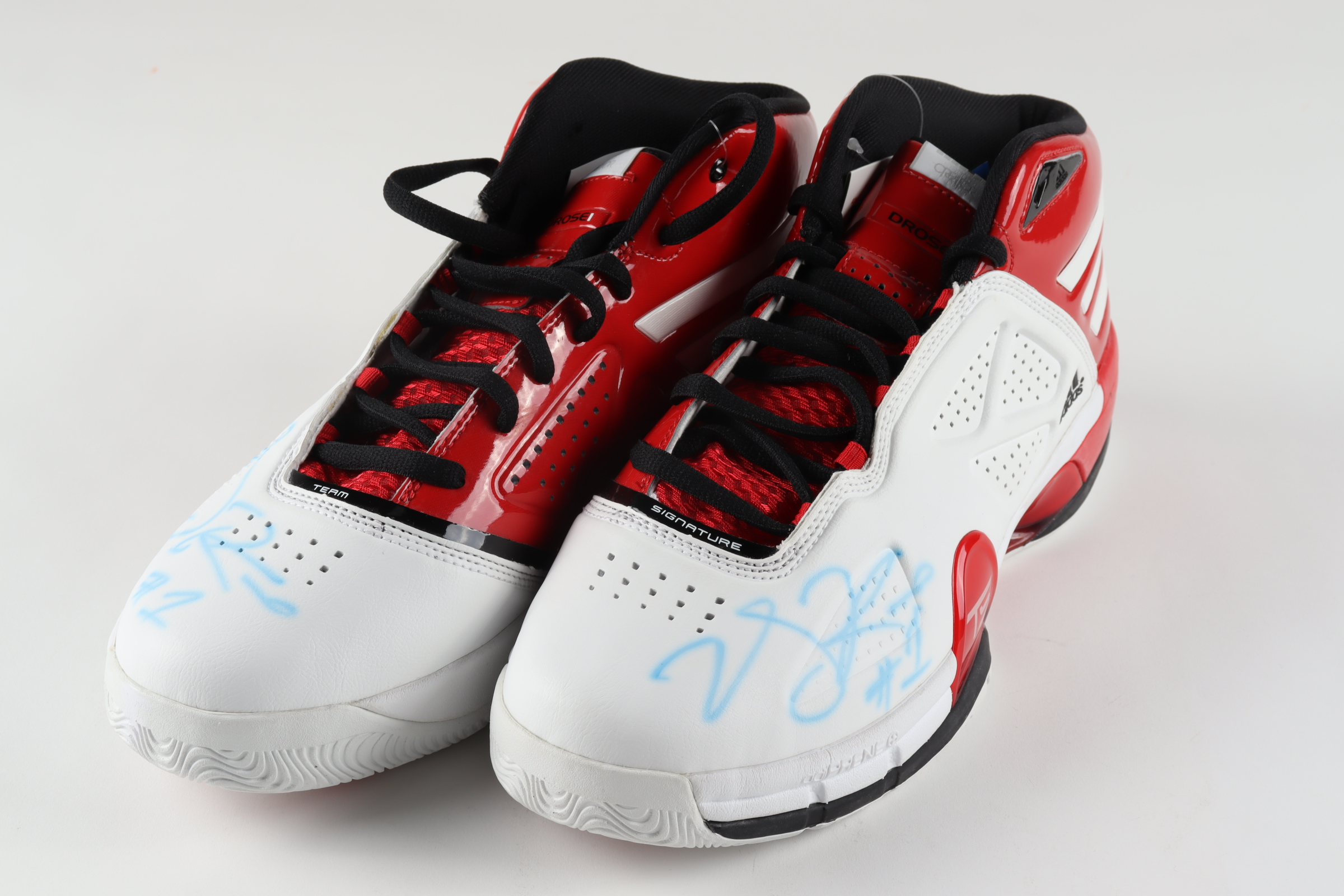 Adidas Derrick Rose signature basketball shoe, size 12. Both shoes have been hand-signed by Derrick Rose (Minnesota Timberwolves).