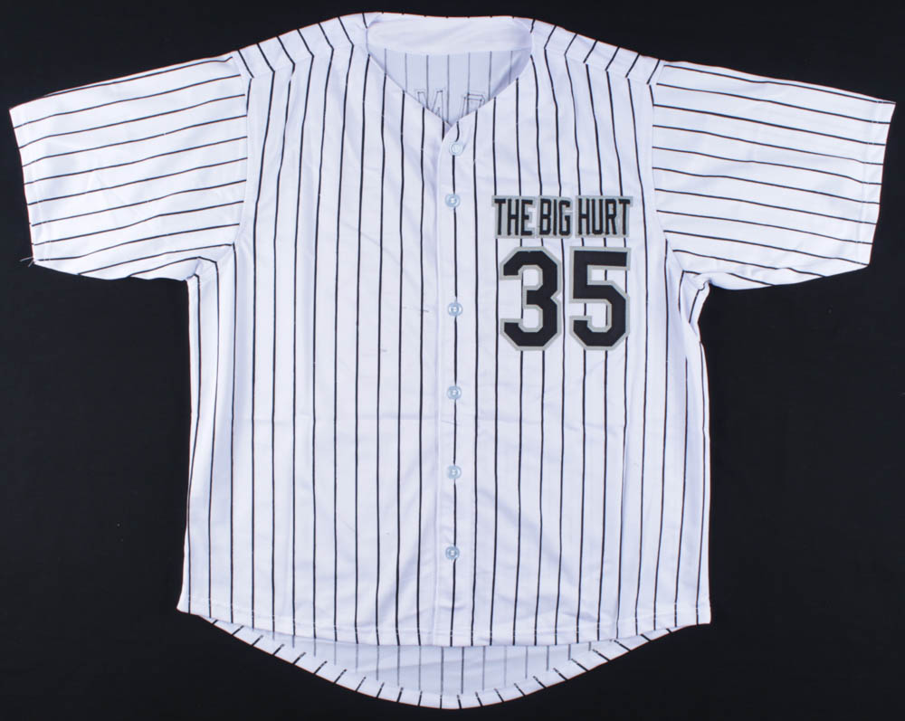 Custom on-field style jersey. Everything is sewn on, size XL. Has been hand-signed by Frank Thomas (HOF). Please note, there are a couple small stains.