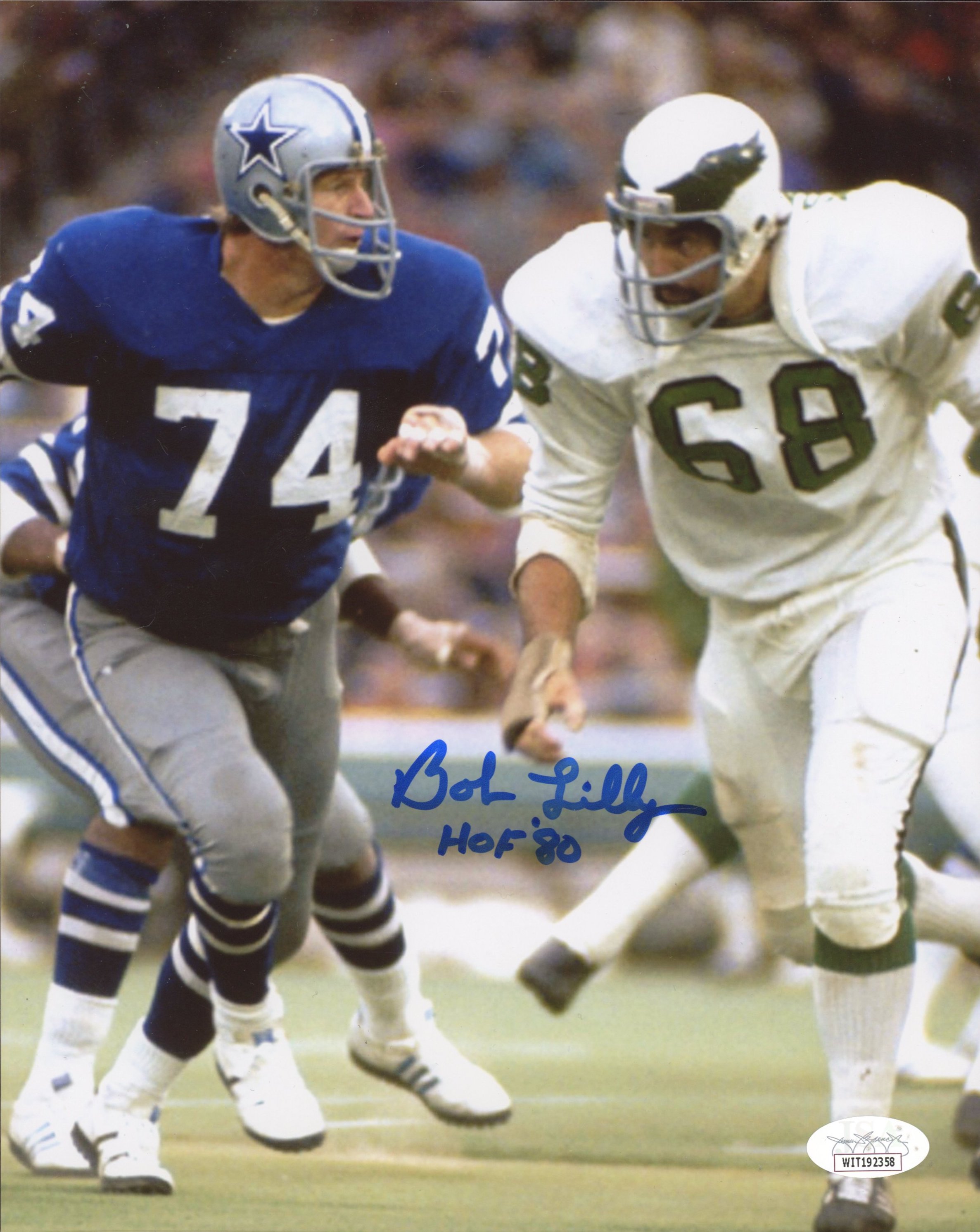 Photo measures 8" x 10" in size and has been hand-signed and inscribed by Bob Lilly (Dallas Cowboys, HOF).