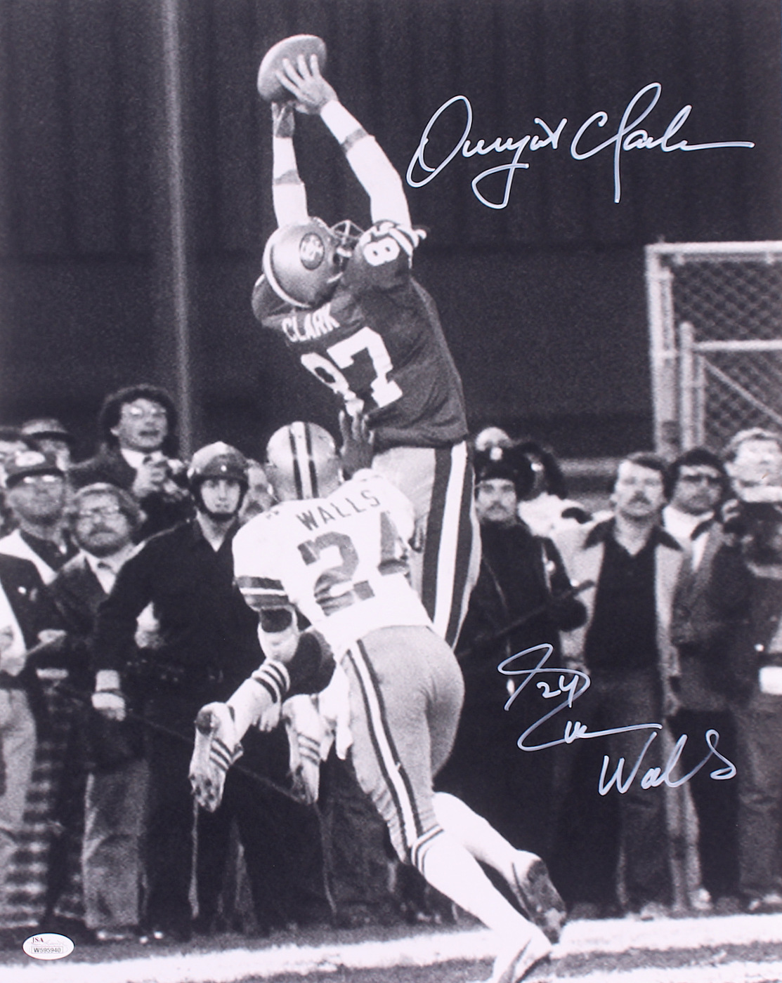 Photo measures 16" x 20" in size and has been hand-signed in white paint pen by Dwight Clark (49ers) and Everson Walls (Cowboys). The autographs include an official James Spence Authentication (JSA) hologram and matching COA for authenticity purposes. The signing of this item was witnessed by JSA.