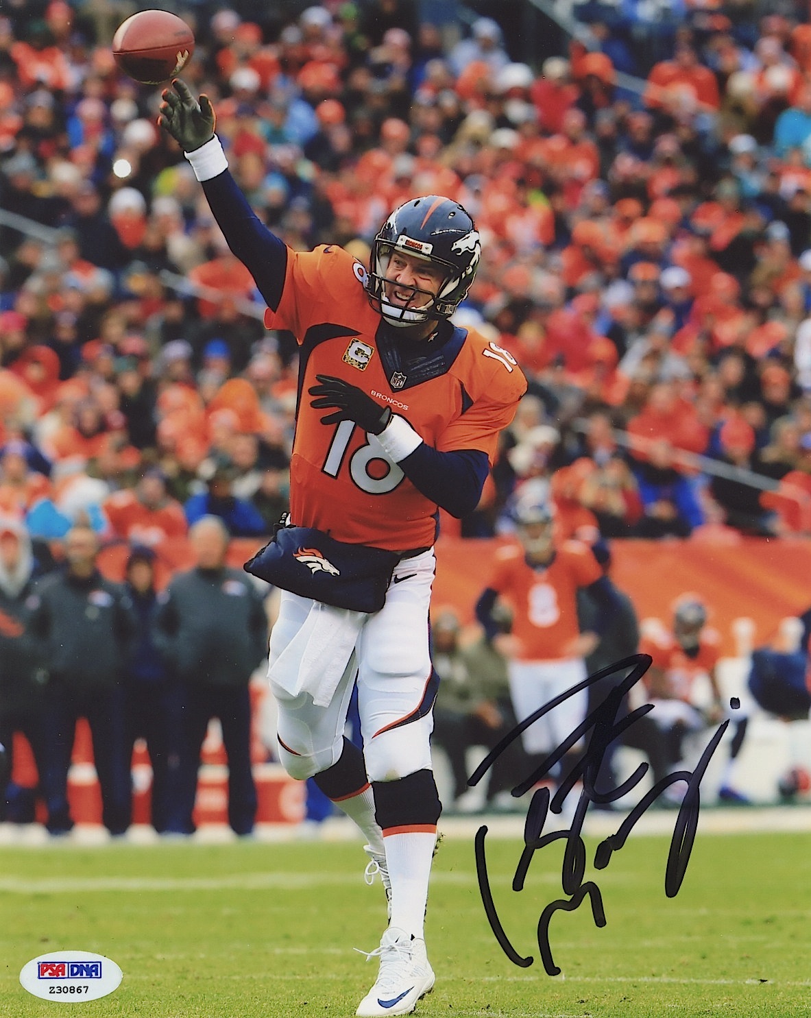 Photo measures 8" x 10" in size and is hand-signed in black felt tip pen by Peyton Manning.