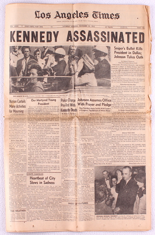 Original Vintage Los Angeles Times Newspaper Dated November 23, 1963 With "Kennedy Assassinated" Cover Story