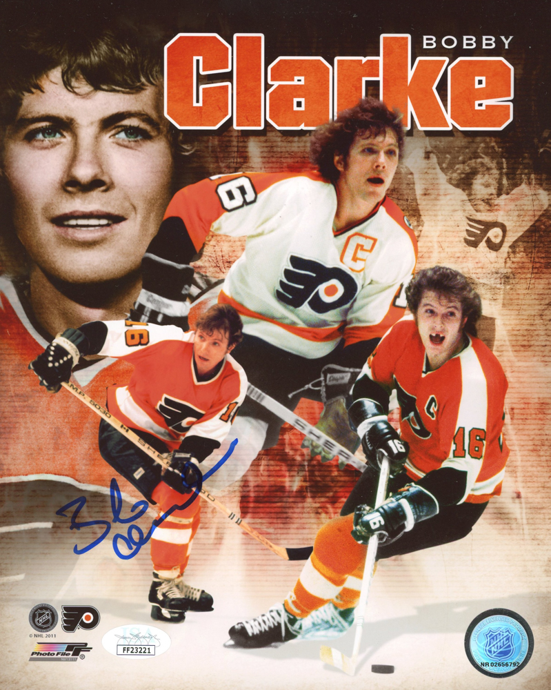 Photo measures 8" x 10" in size and has been hand-signed by Bobby Clarke (Philadelphia Flyers, HOF).