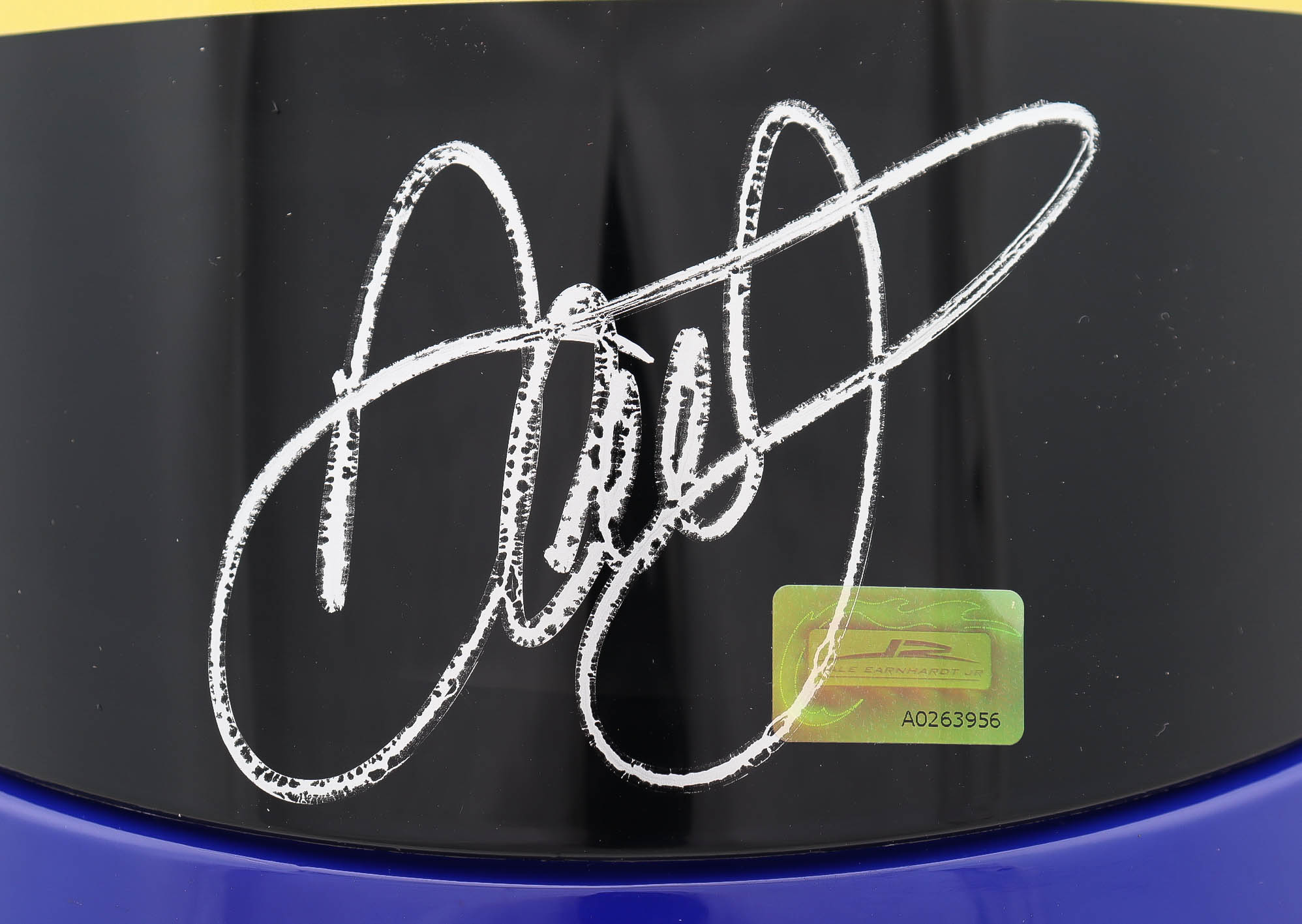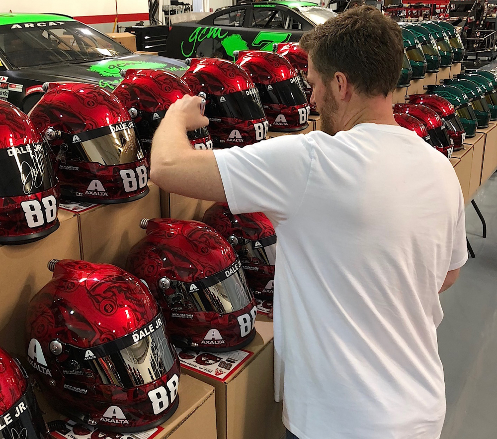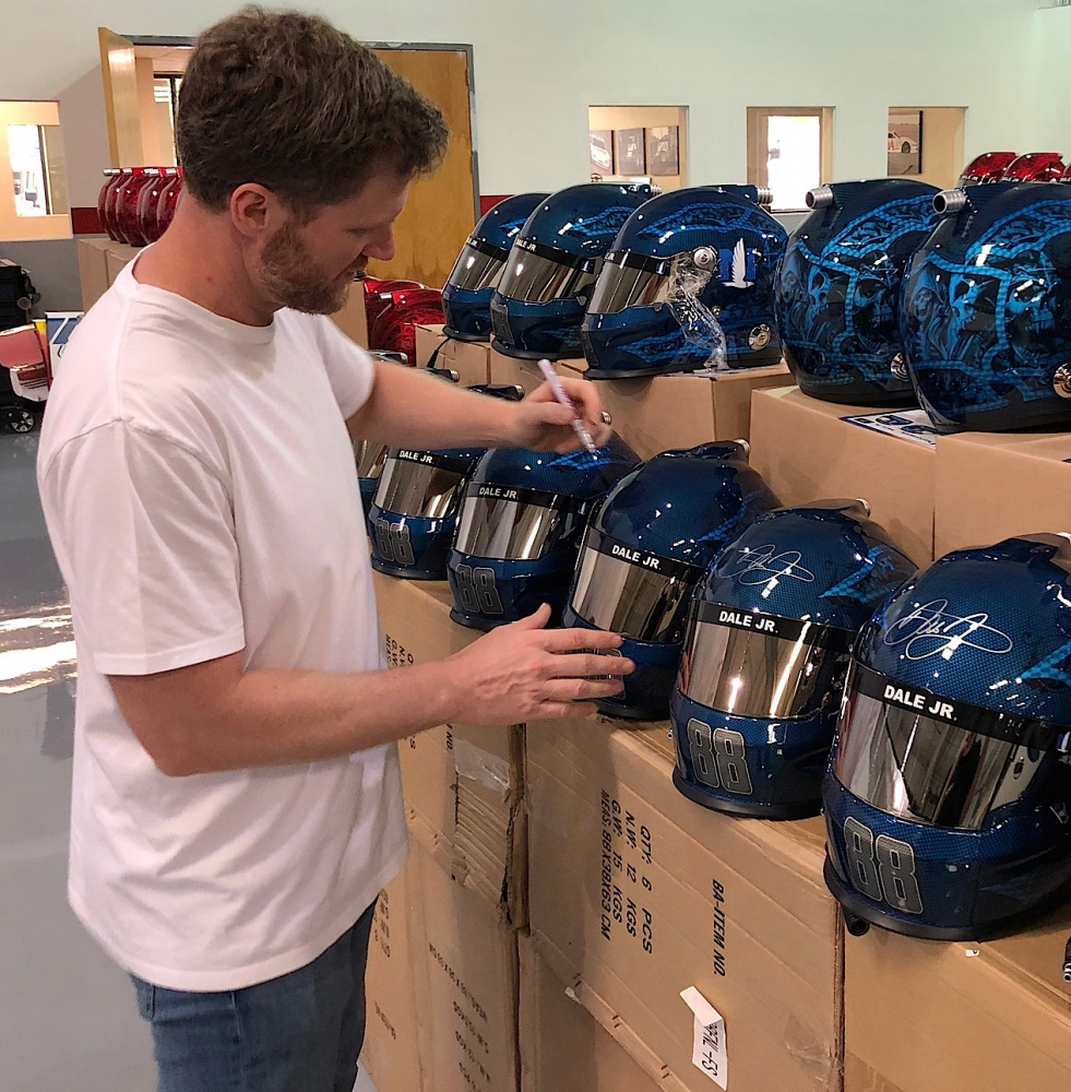 Full-size replica NASCAR helmet is hand-signed on the visor by Dale Earnhardt Jr.