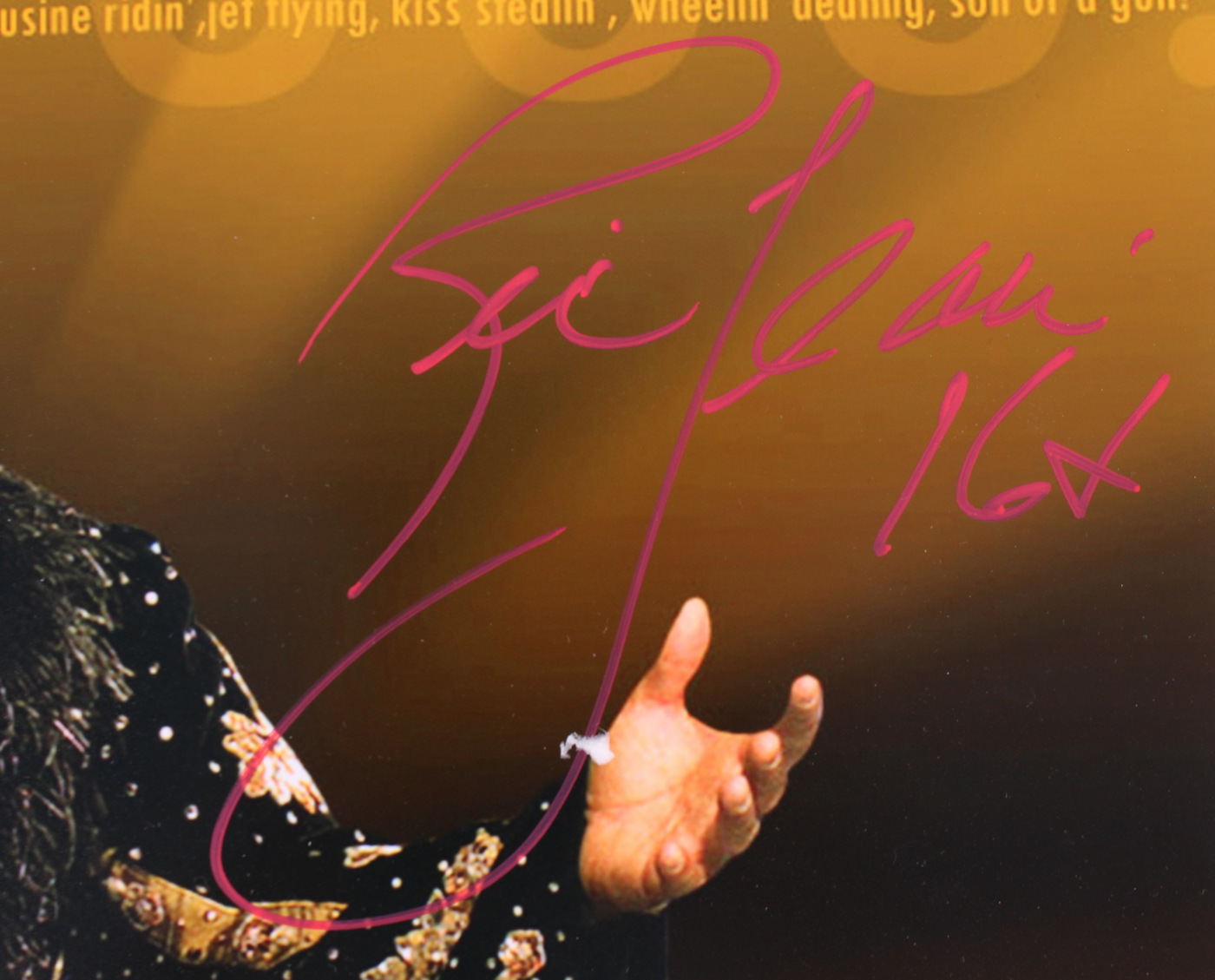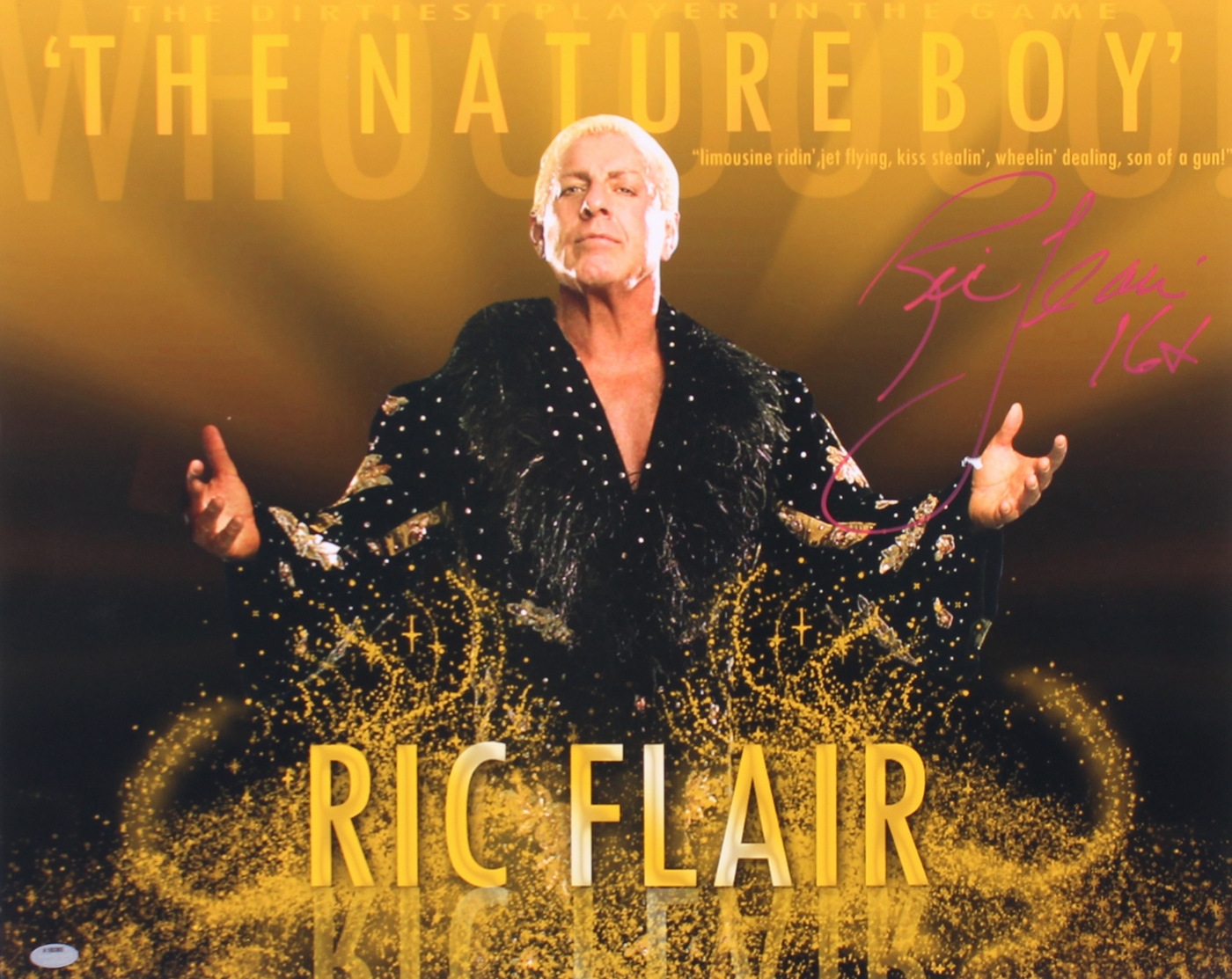 Photo measures 16" x 20" in size and has been hand-signed in red paint pen by Ric Flair.