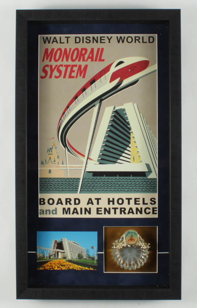 Custom framed shadowbox display measures 14.5" x 25.5" x 2" in size. The display also includes a vintage Disney World ash tray as well as a souvenir "Monorail" postcard.