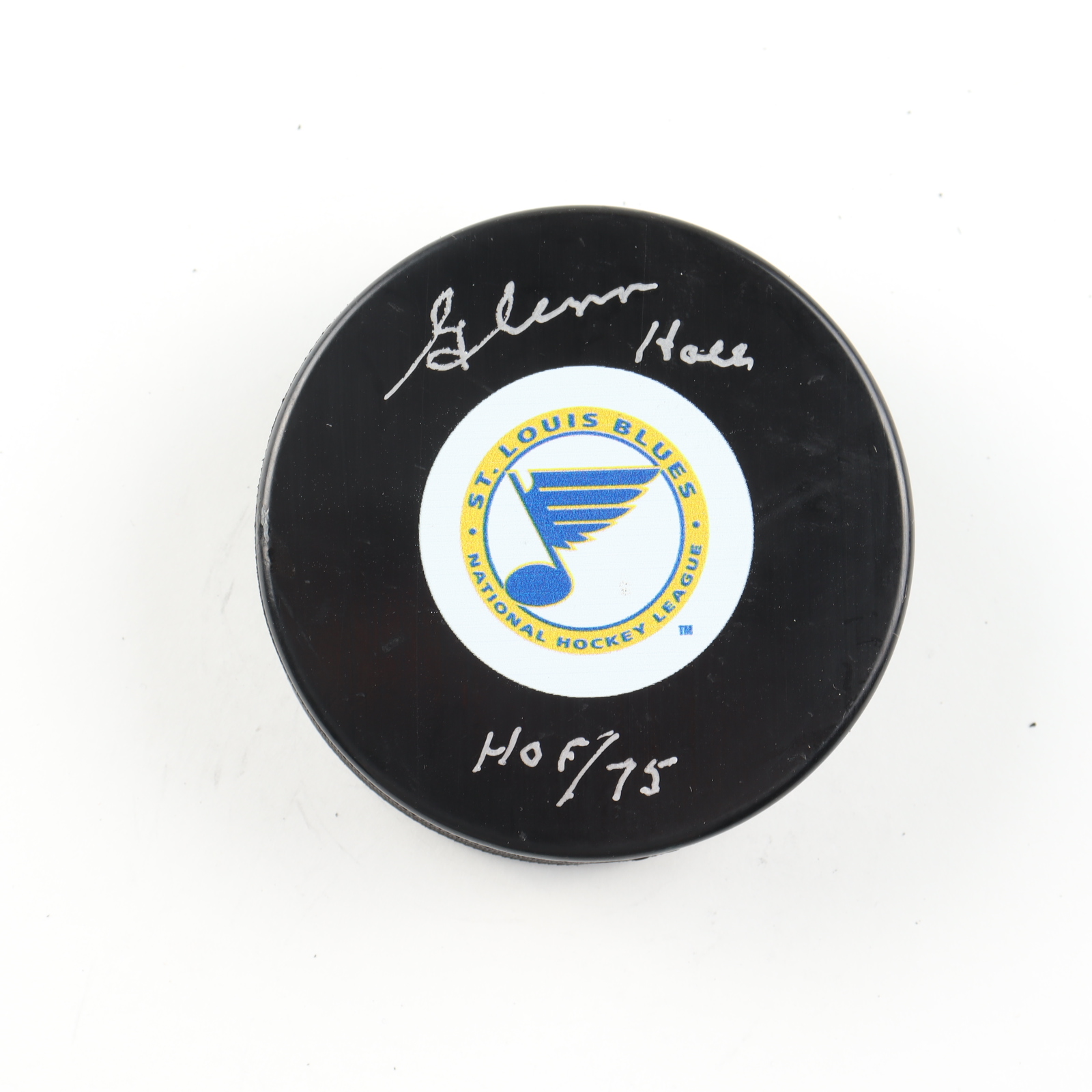 Glenn Hall Signed Blues Logo Hockey Puck Inscribed "HOF / 75" (COJO COA)