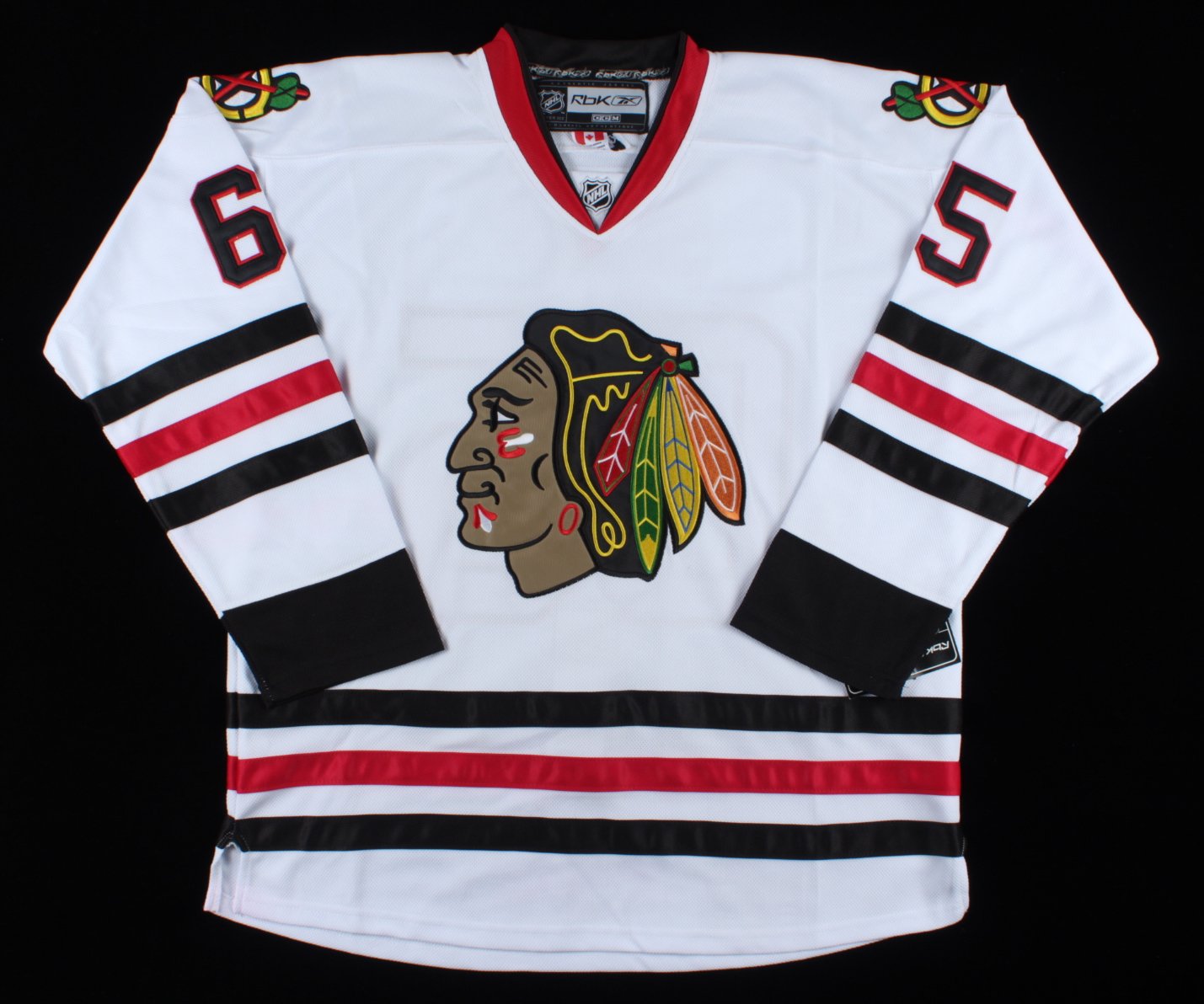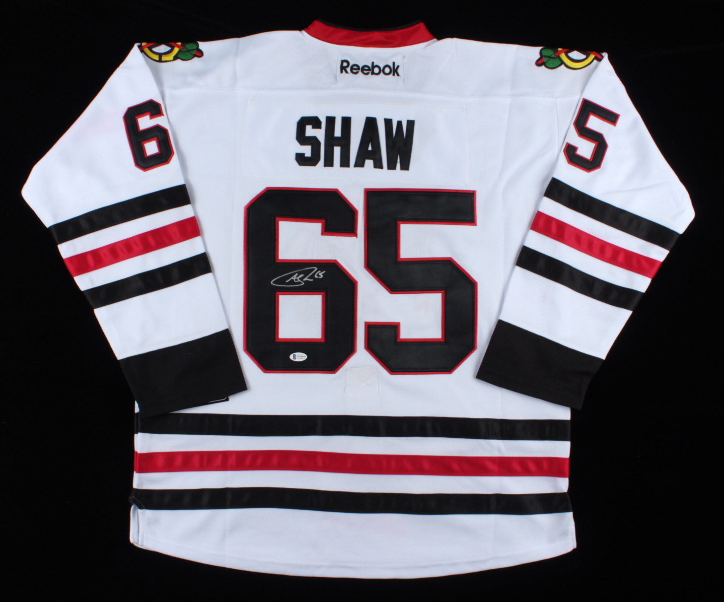 Reebok on-ice style jersey. Everything is sewn on, size XL. Hand-signed by Andrew Shaw (Chicago Blackhawks).