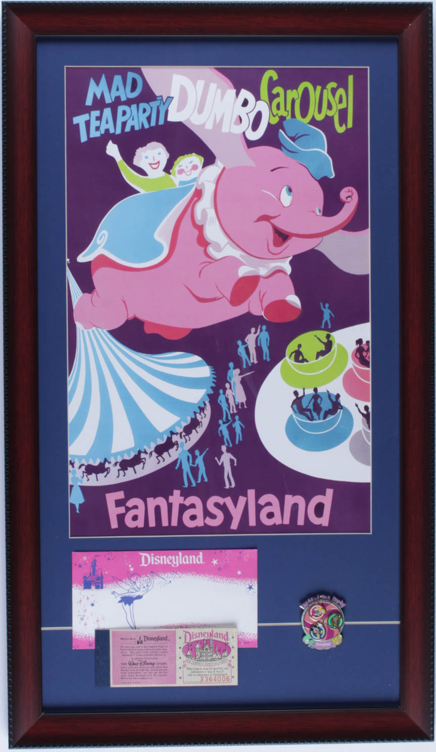 Disneyland Fantasyland's "Dumbo" 15x26 Custom Framed Print Display with Vintage Original Ticket Book Envelope & Ride Lapel Pin
