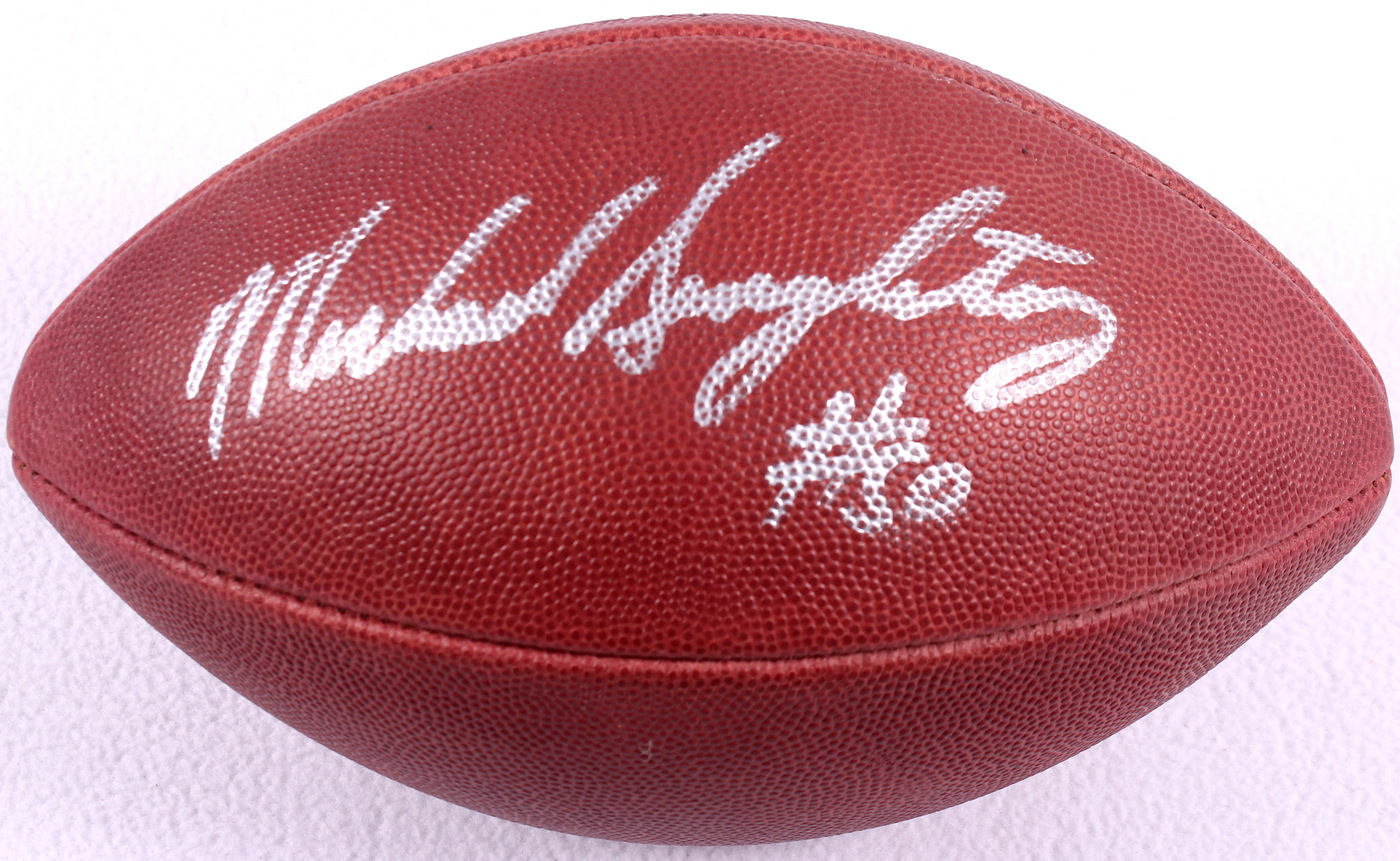 Wilson NFL full-size football hand-signed in silver paint pen by Mike Singletary (Bears HOF). The autograph includes an official James Spence Authentication (JSA) hologram and matching COA for authenticity purposes.