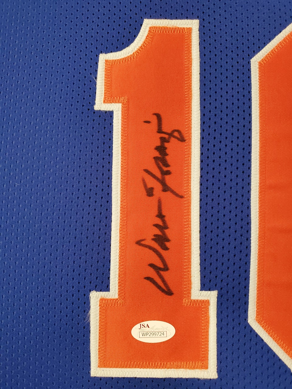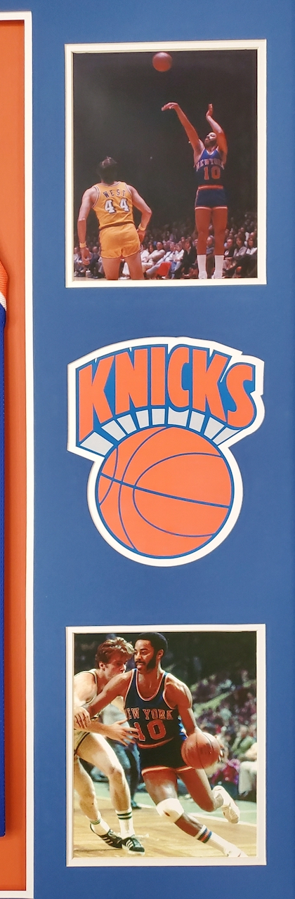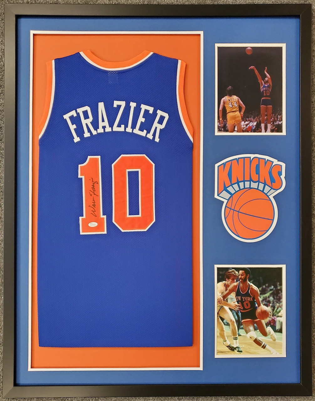 Custom framed display features a jersey that has been hand-signed by Walt Frazier (HOF).