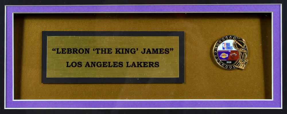 Custom frame measures approximately 32" x 36" in size and features a jersey of LeBron James. Includes a 2020 Los Angeles Lakers Championship pin. Please note, the jersey is unsigned.