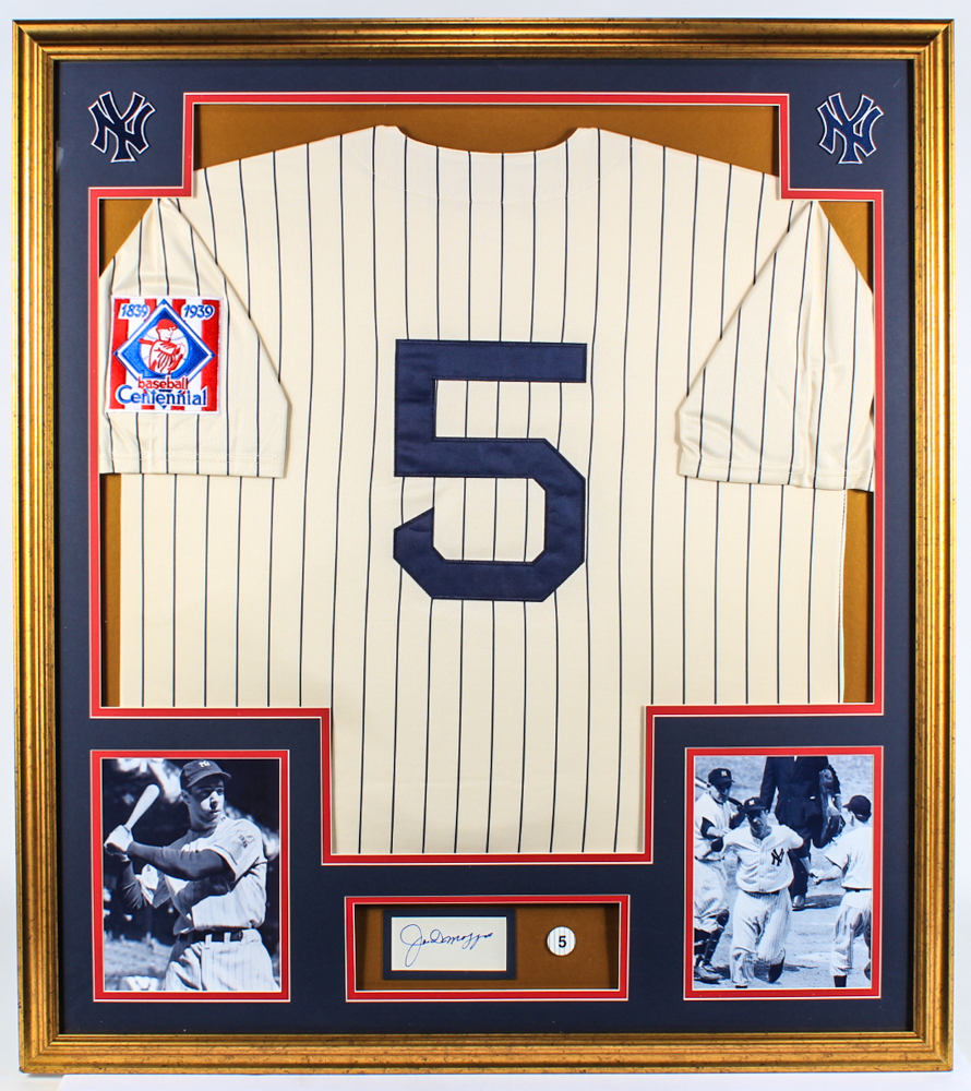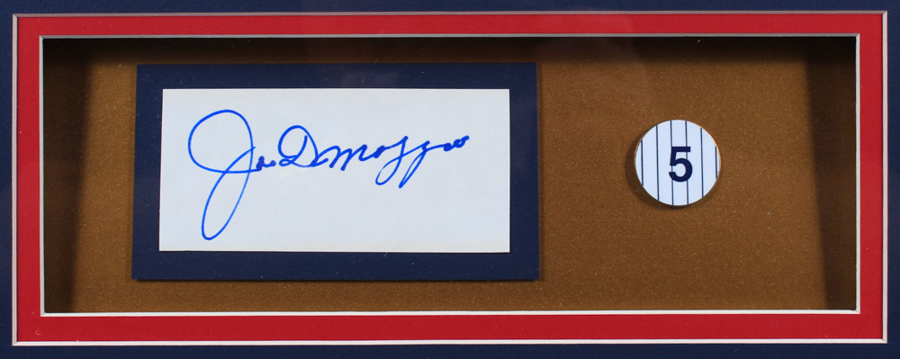 Custom frame measures approximately 32" x 36" in size and features a cut that has been hand-signed by Joe DiMaggio (D. 1999, New York Yankees, HOF). Also includes a jersey, a retirement pin, (2) New York Yankees patches, (2) photos of DiMaggio.