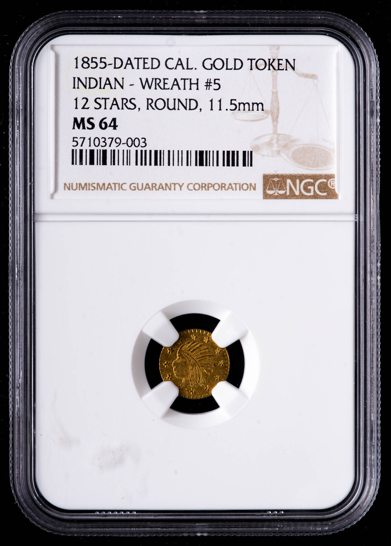 1855-Dated Californai Gold Token Indian - Wreath #5 12 Stars Round (NGC MS64)