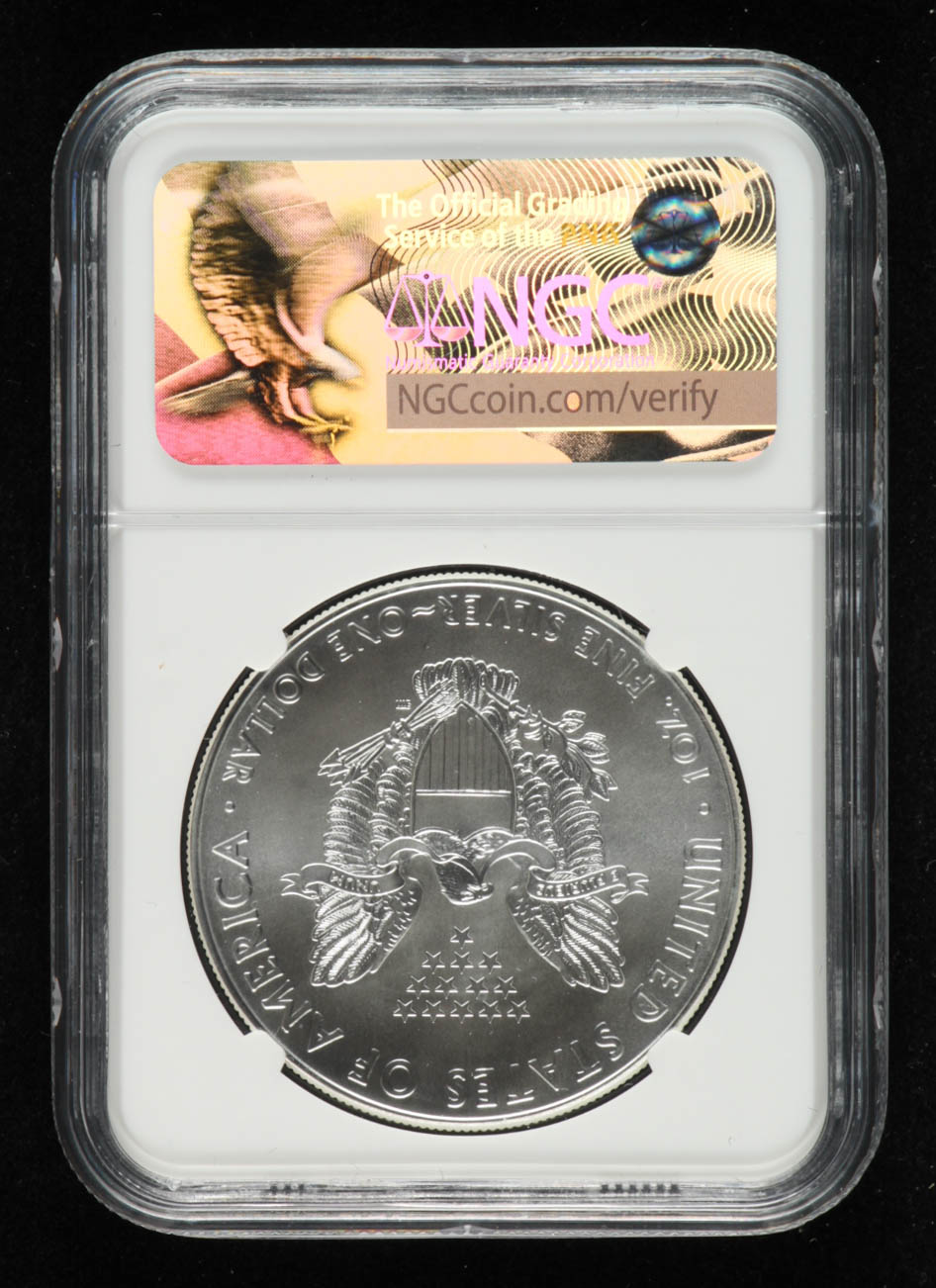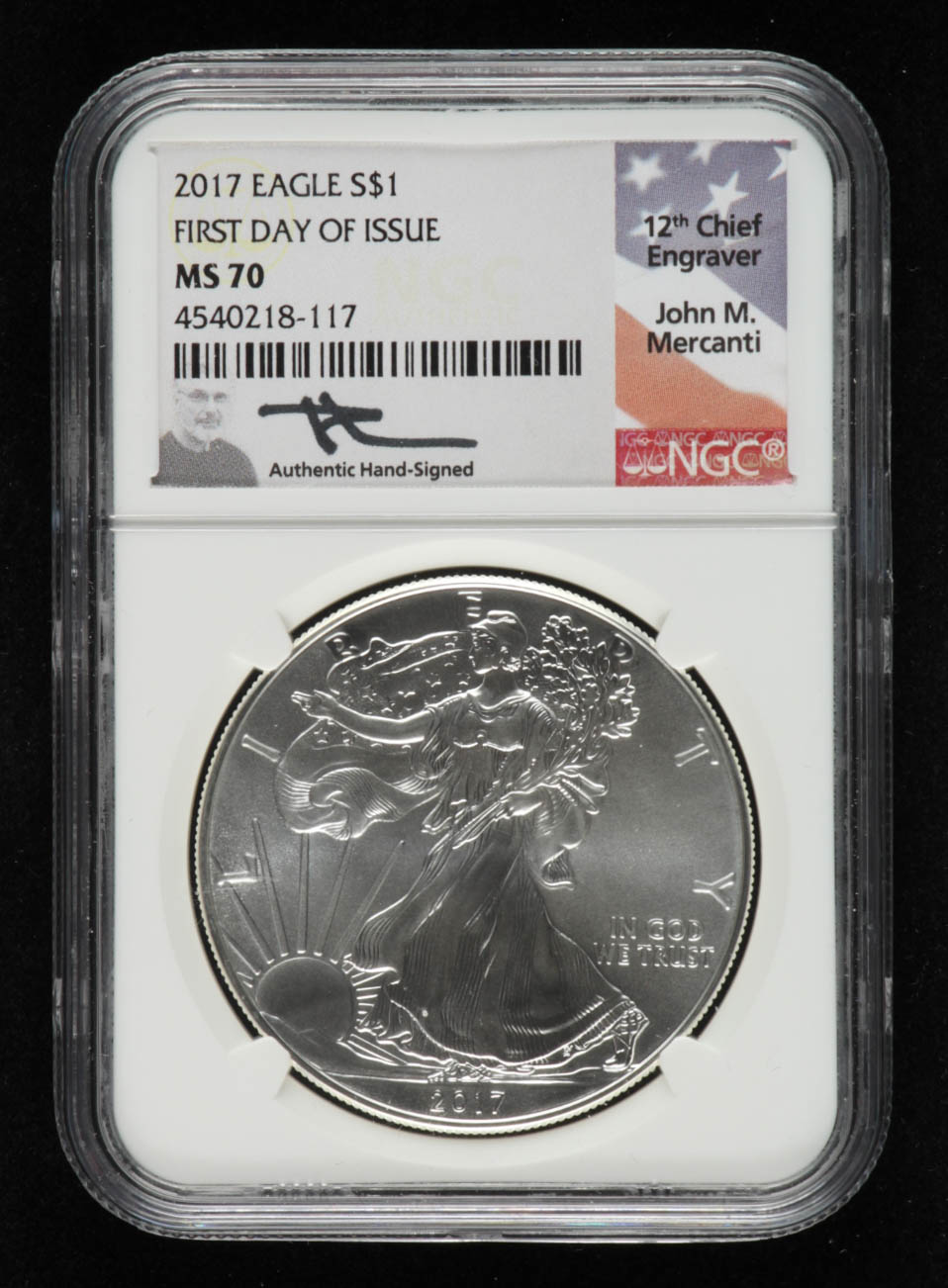2017 American Silver Eagle $1 One Dollar Coin, First Day of Issue - John M. Mercanti Signed Label (NGC MS70)