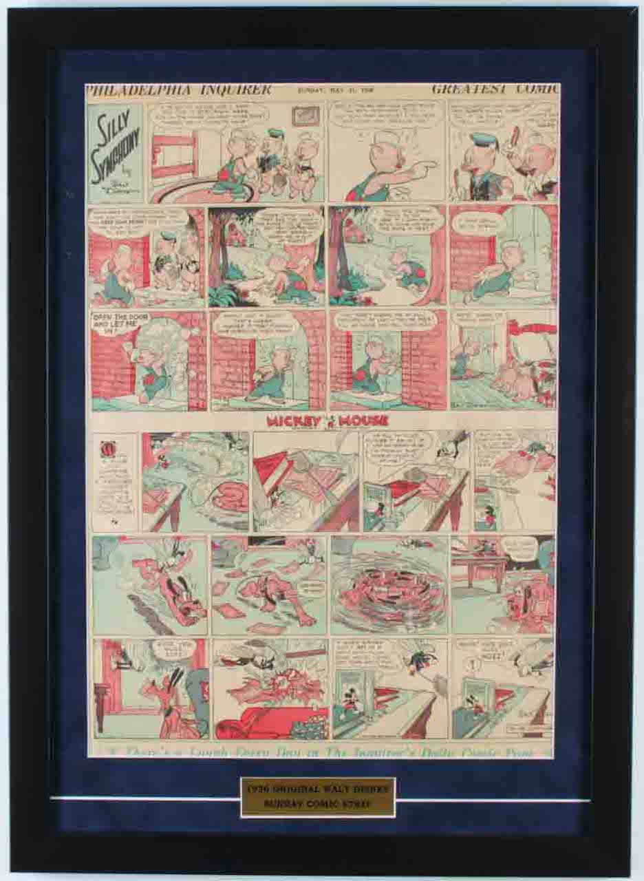 Custom framed display measures 18" x 25" in size and features a vintage May 31st, 1936 Philadelphia Inquirer Mickey Mouse / Silly Symphony Newspaper Comic Strip.