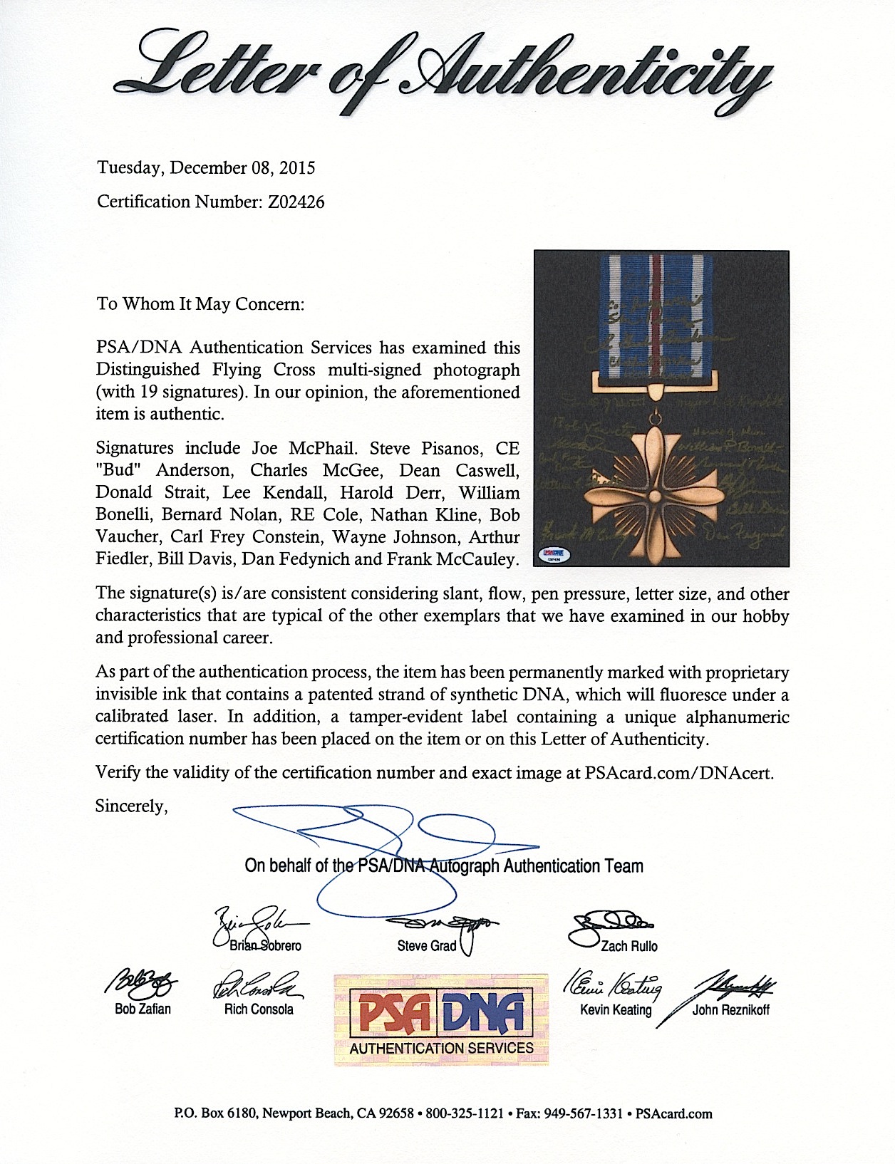 WWII Distinguished Flying Cross 8x10 Photo Signed by (19) Recipients with Lee Kendall, Richard E. Cole, Joe McPhail (PSA LOA)