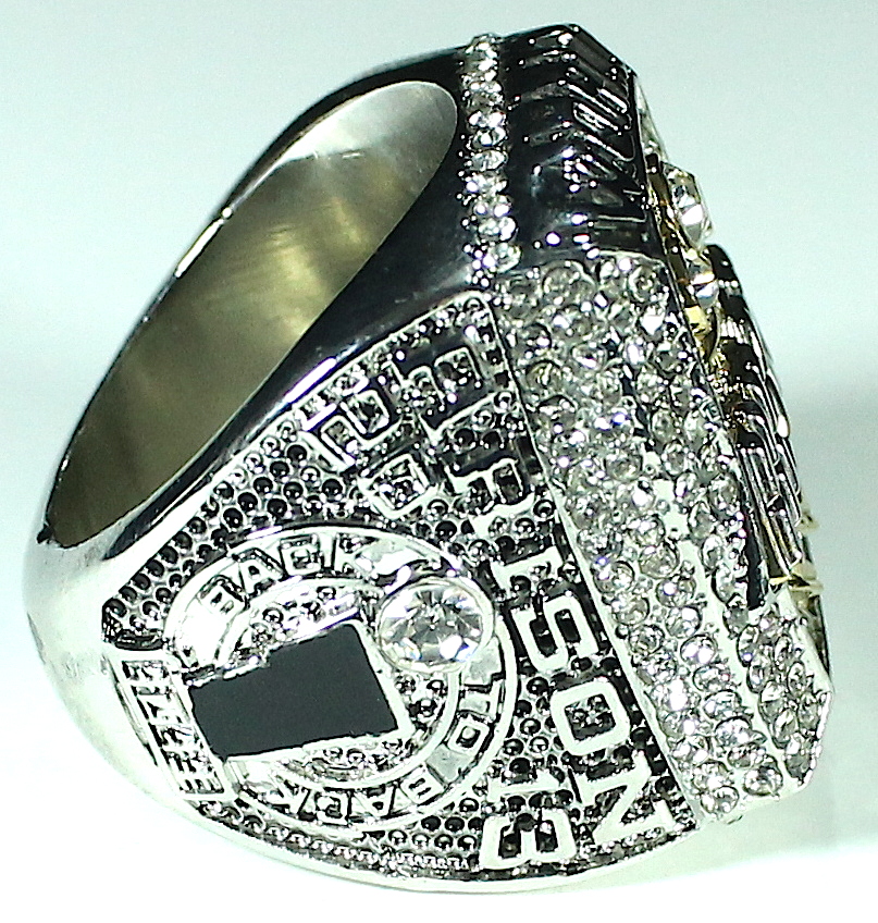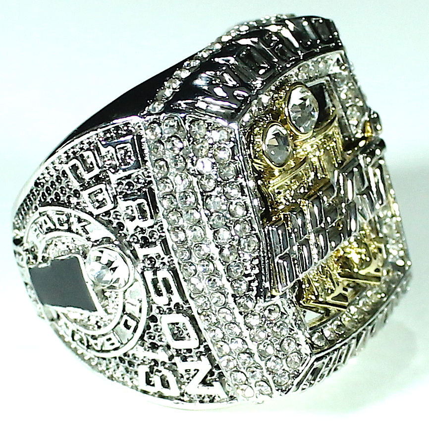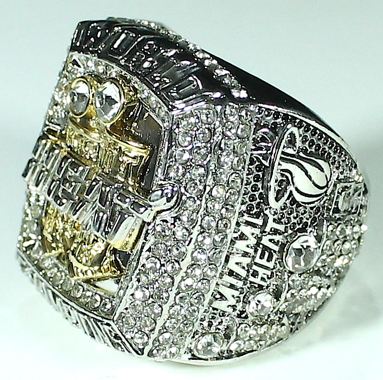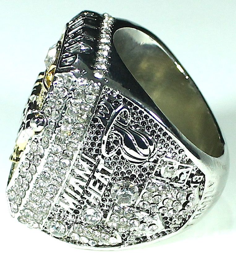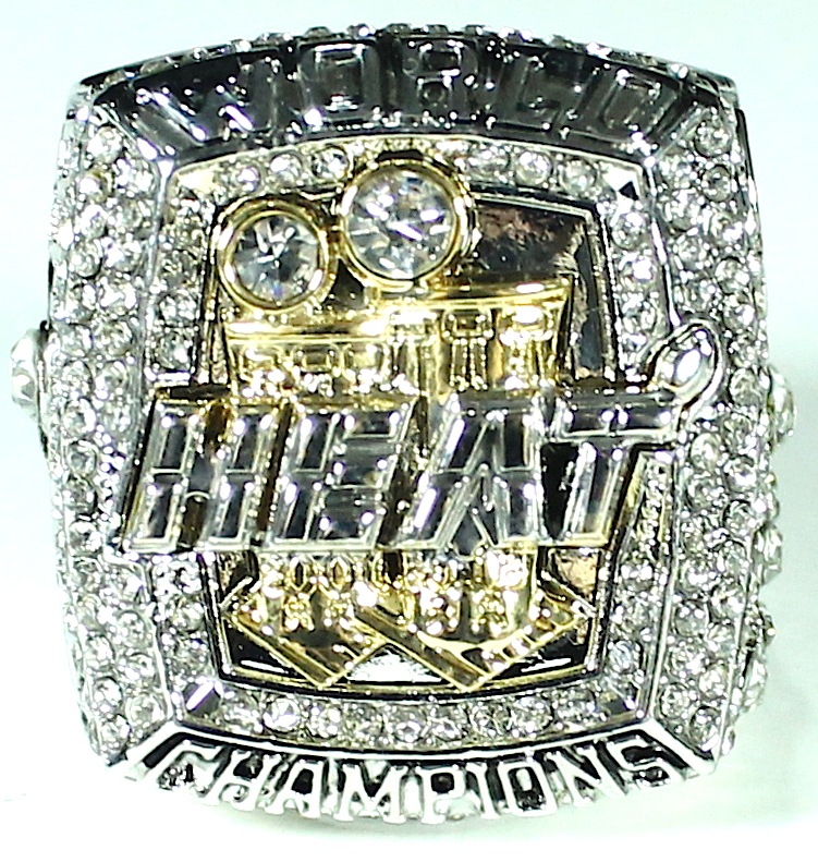Miami Heat High Quality Replica 2013 NBA Champions Ring. The ring has been hand crafted by professional jewelers. Made of metal alloy and clad with 18K Gold & silver. Size 10.5.