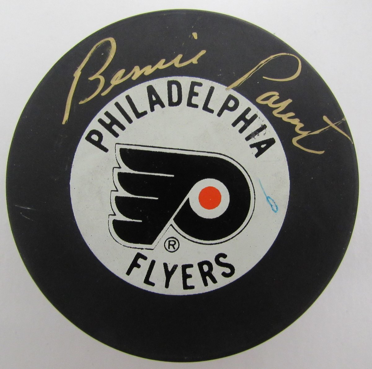 Philadelphia Flyers logo hockey puck. Has been hand-signed by Bernie Parent (HOF).
