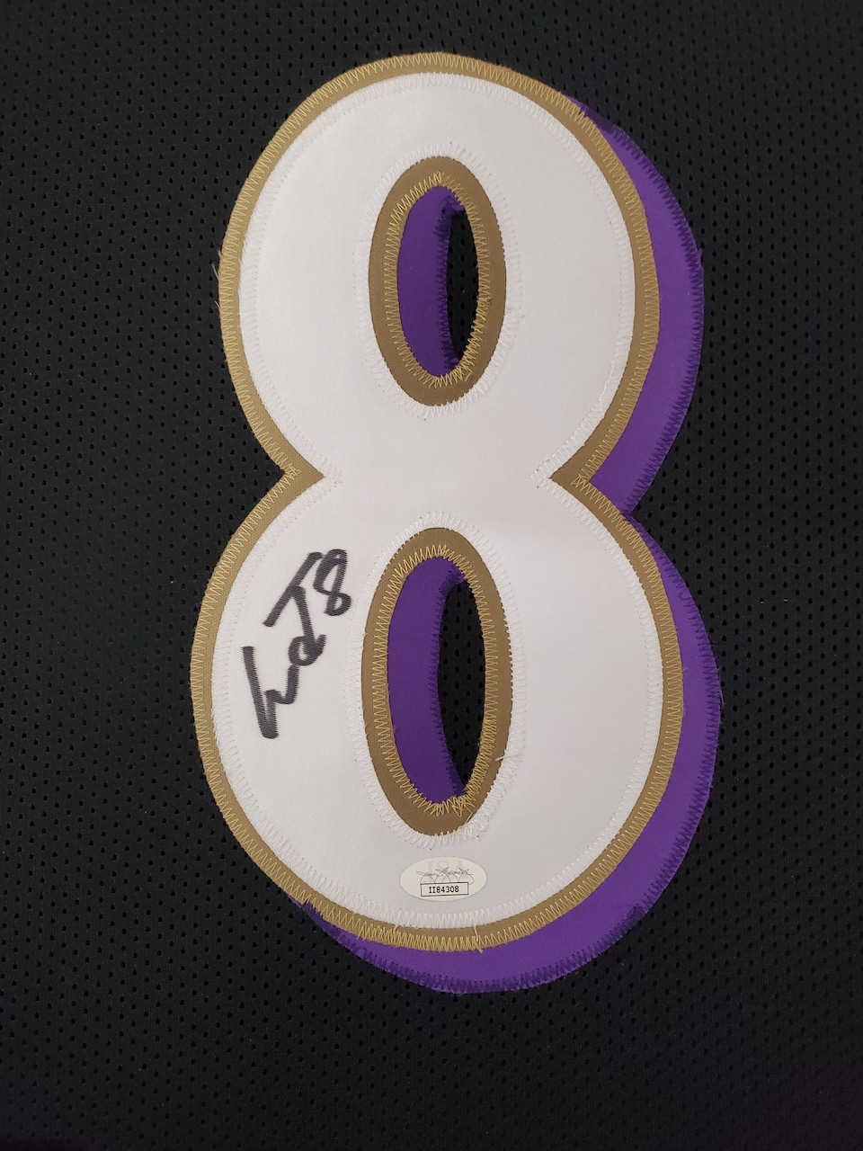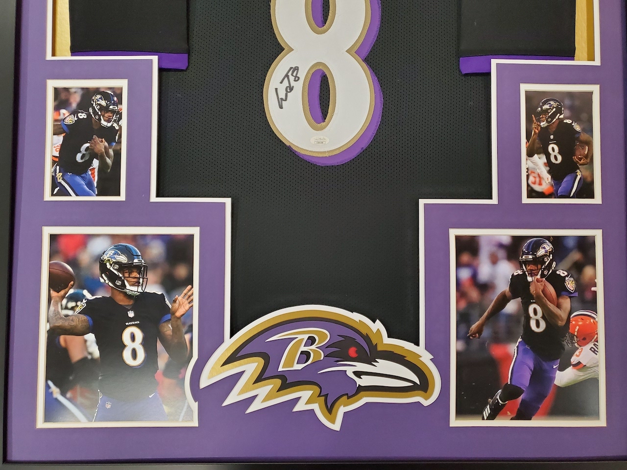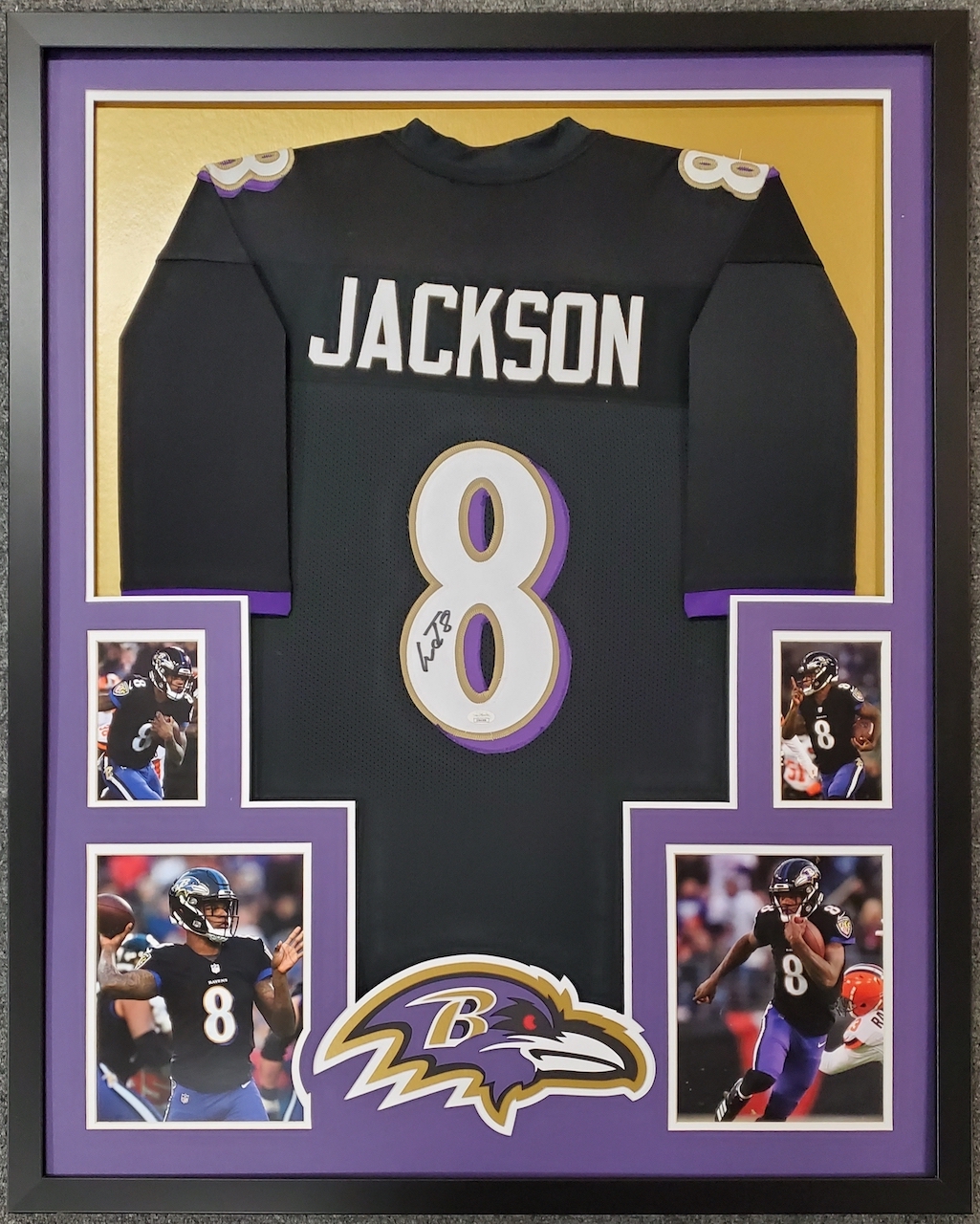 Custom framed display features a jersey that has been hand-signed by Lamar Jackson.
