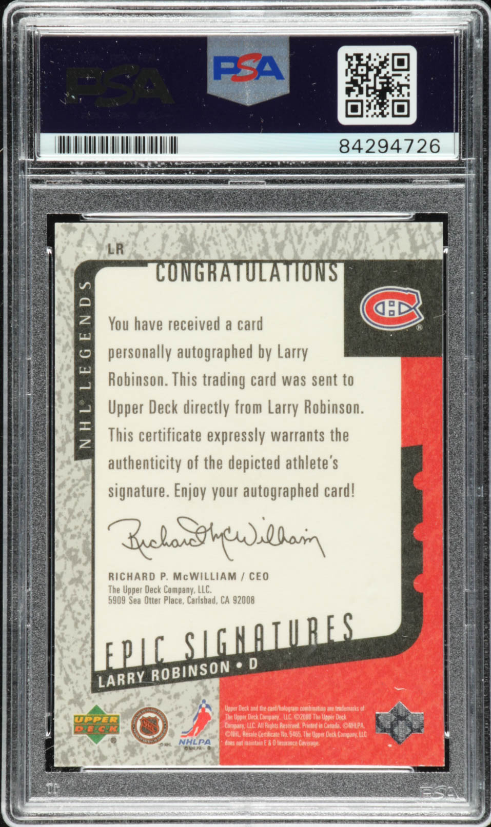 Larry Robinson 2000-01 Upper Deck Legends Epic Signatures #LR (PSA Encapsulated)