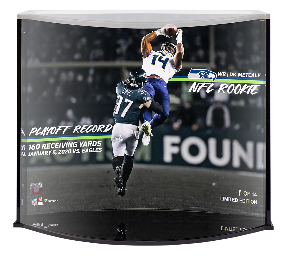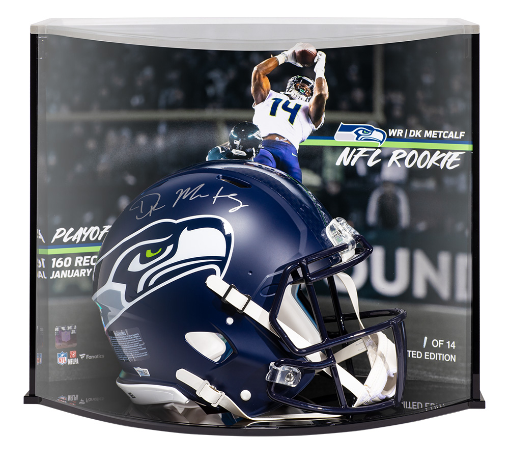 Riddell Seattle Seahawks full-size authentic on-field speed helmet. Hand-signed by DK Metcalf. The display is a limited edition and the photo has been hand-numbered #/14.