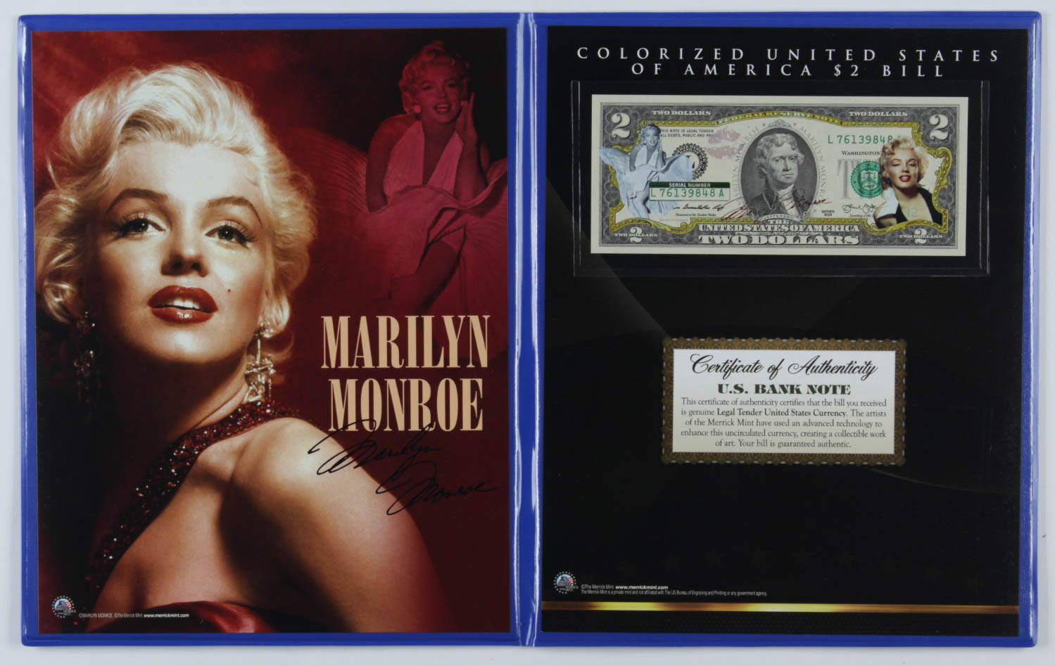 Marilyn Monroe Genuine Legal Tender Colorized U.S. $2 Bill Commemorative Edition Bank Note. Includes folder as shown.