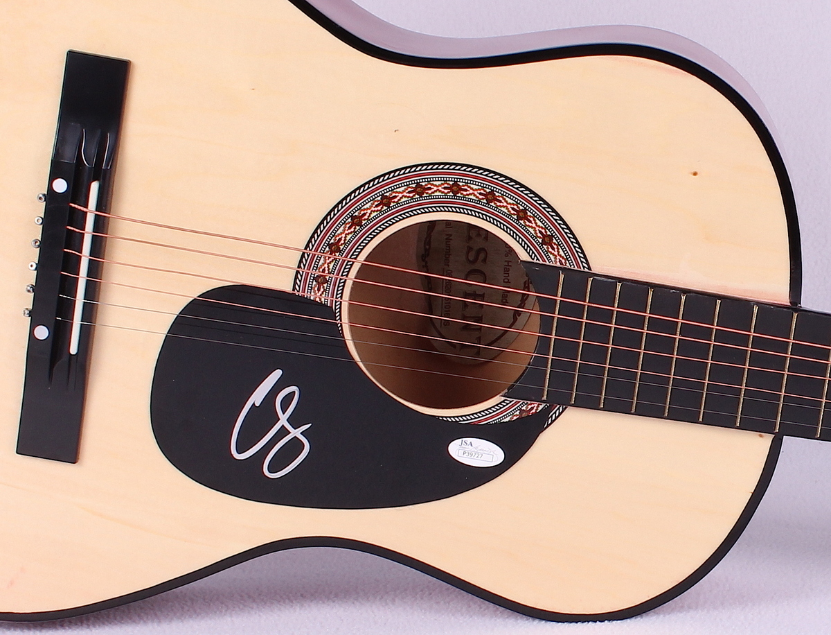 Crescent acoustic guitar measures 38" in length. Hand-signed in silver paint pen by Chris Stapleton. This guitar is a display guitar. It is a full size guitar but is a lower tier version and is not the same quality as one that a musician would play. Please see the images below for further details on the condition of the guitar.