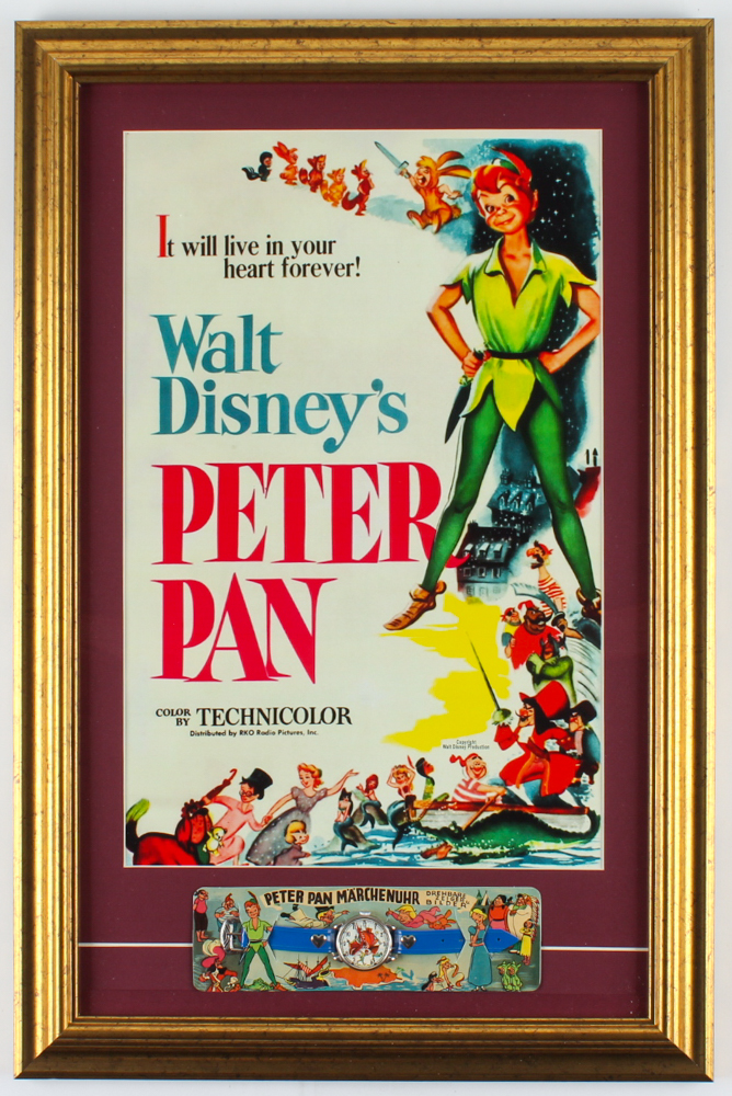 "Peter Pan" 15.75x23.75 Custom Framed Print Display with 1950s Germany Disney Watch