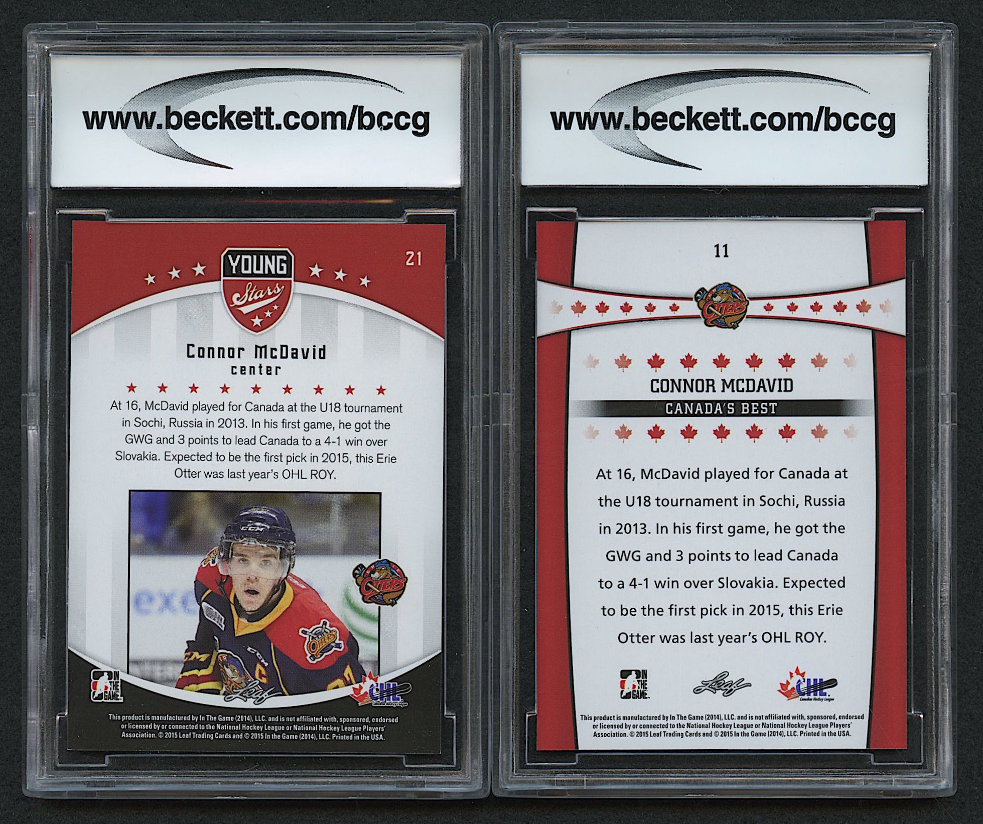 Lot of (2) Connor McDavid Graded (BCCG 10) 2015 ITG CHL Draft Hockey Cards with #11 Canada's Best & #21 Young Stars