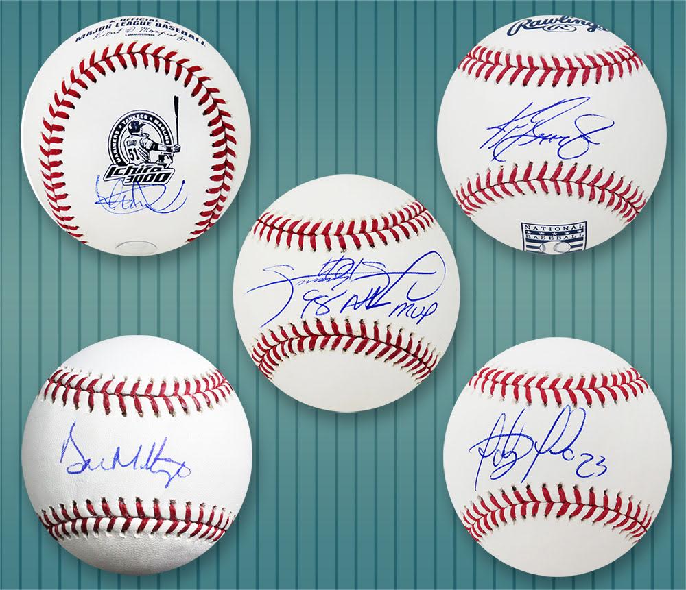 Each box contains one Baseball star autographed Rawlings official baseball AND one Baseball star autographed full-size Baseball Bat that has been randomly inserted. All boxes contain at least one MLB Award Winner (MVP, Rookie of the Year, CY Young, World Series MVP). There are over 45 different players included in this Series 2 Double Play mystery box, which is a Pristine Exclusive edition that is limited to 75 boxes.