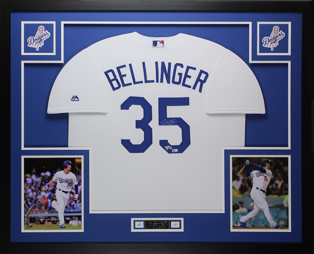 Custom frame measures approximately 35" x 43" in size. Features a Majestic on-field style jersey signed by Cody Bellinger (Los Angeles Dodgers).