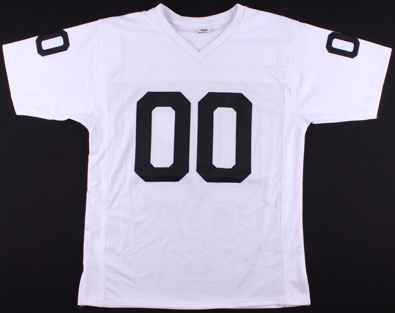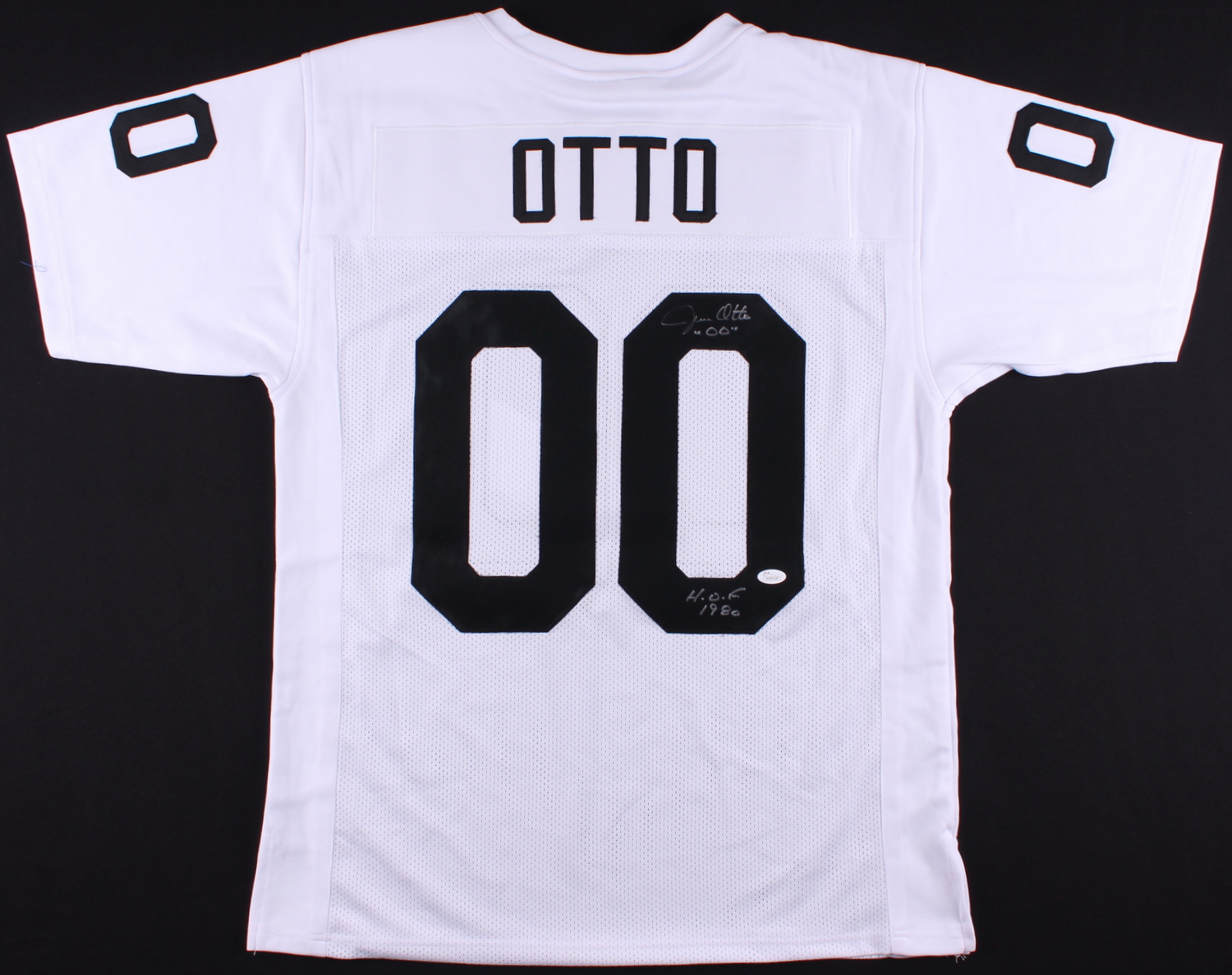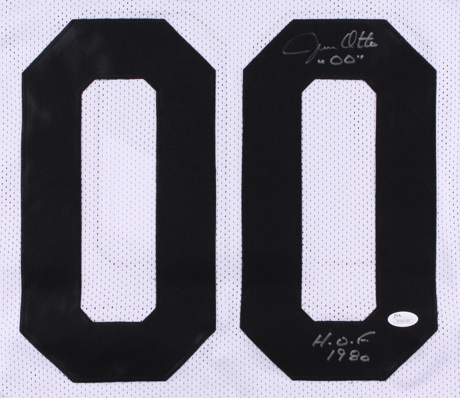 Custom on-field style jersey. Everything is sewn on, size XL. Hand-signed and inscribed in silver paint pen by Jim Otto (Raiders HOF). The autograph includes an official James Spence Authentication (JSA) hologram and matching COA for authenticity purposes. The signing of this item was witnessed by JSA.