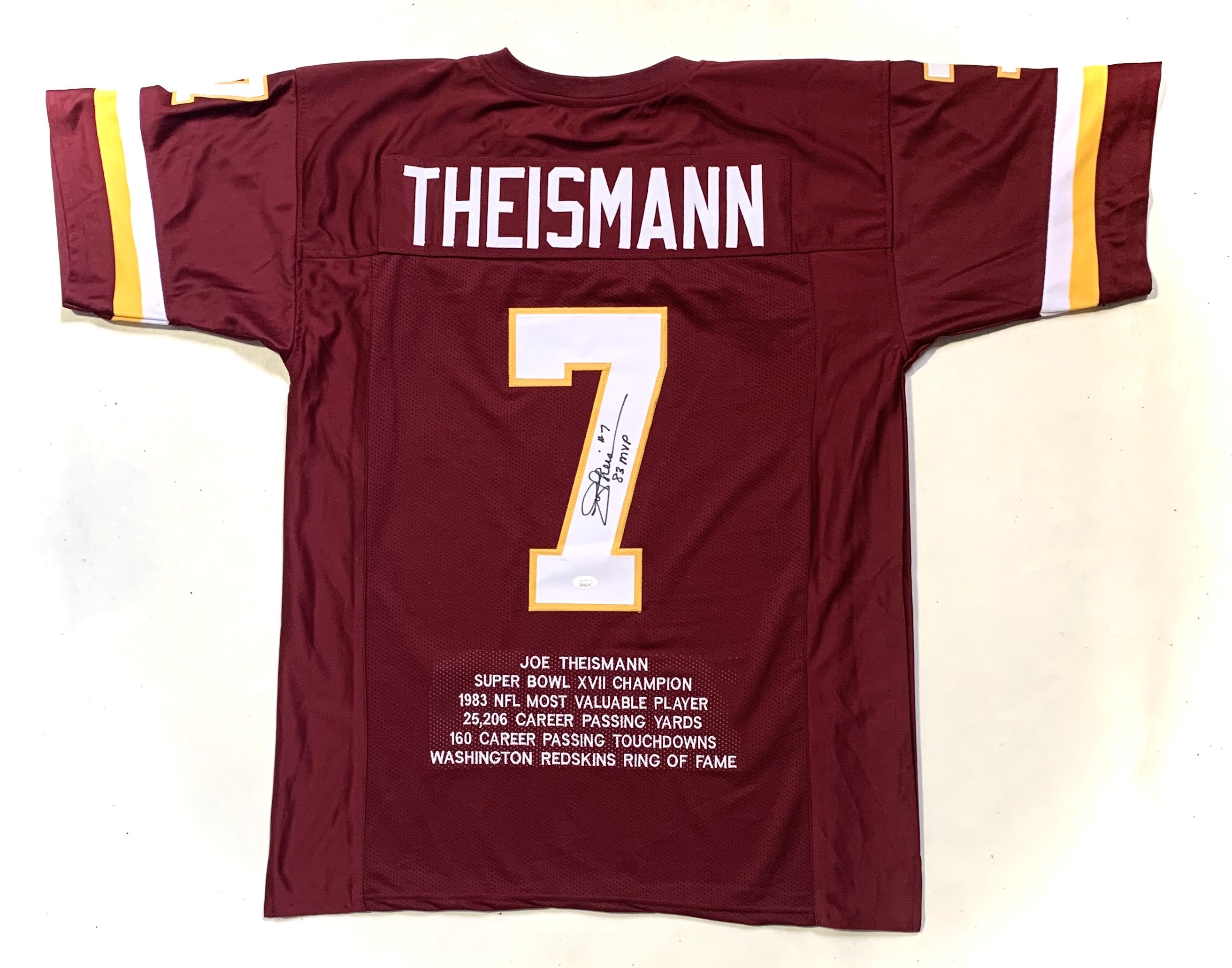Joe Theismann Signed Career Highlight Stat Jersey Inscribed "83 MVP" (JSA COA)