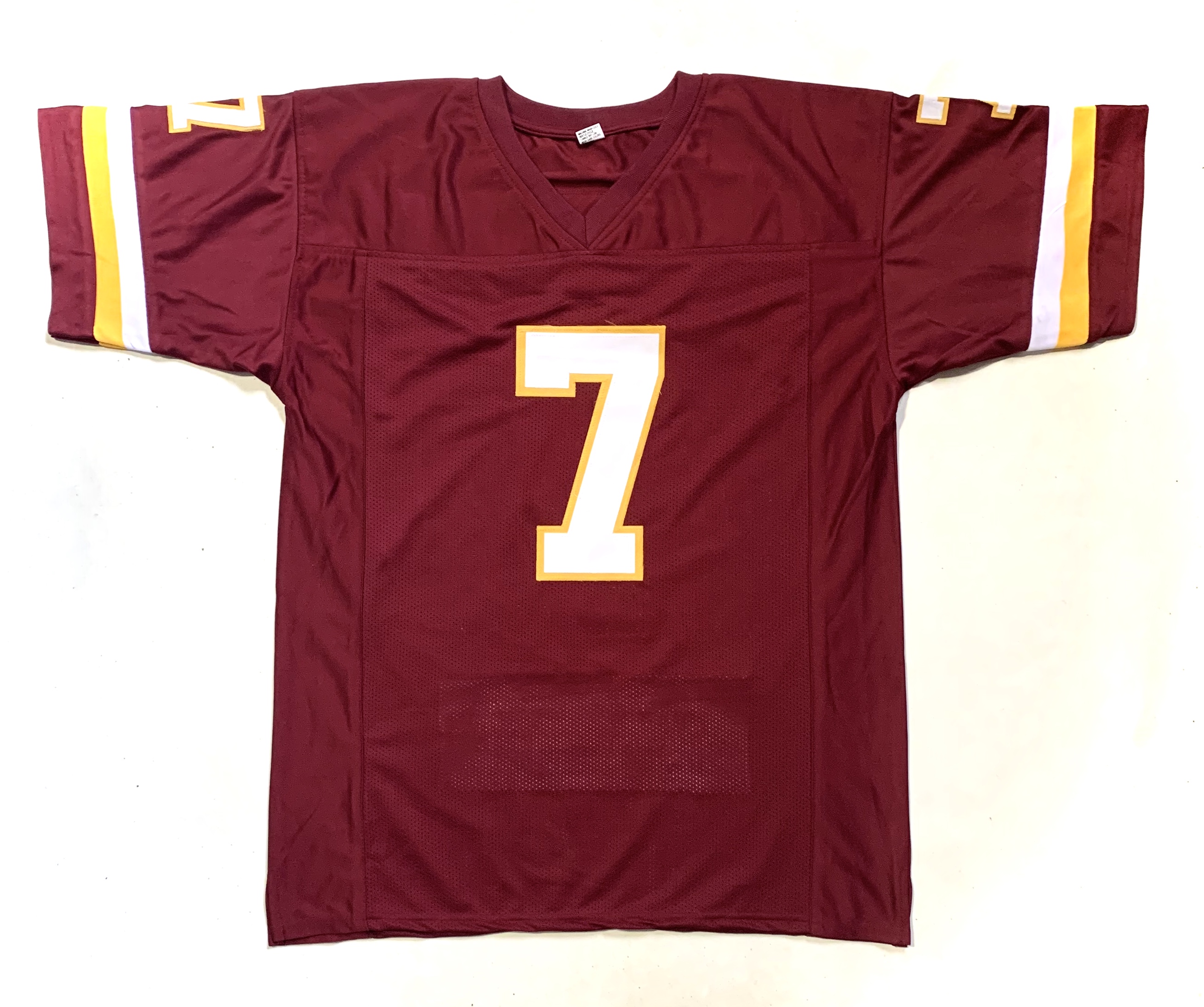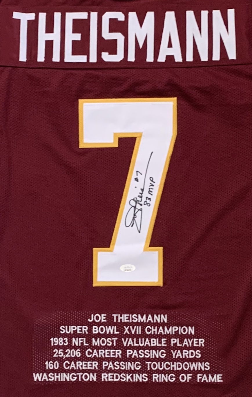 Custom on-field style jersey. Everything is sewn on, size XL. Has been hand-signed by Joe Theismann. Theismann's career highlights have been custom stitched onto the back of the jersey below the reverse numbers.